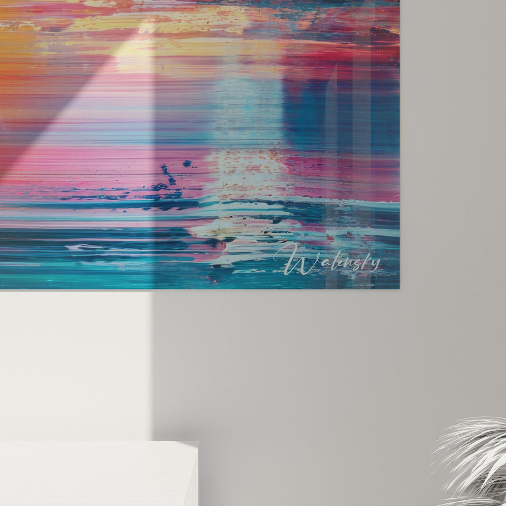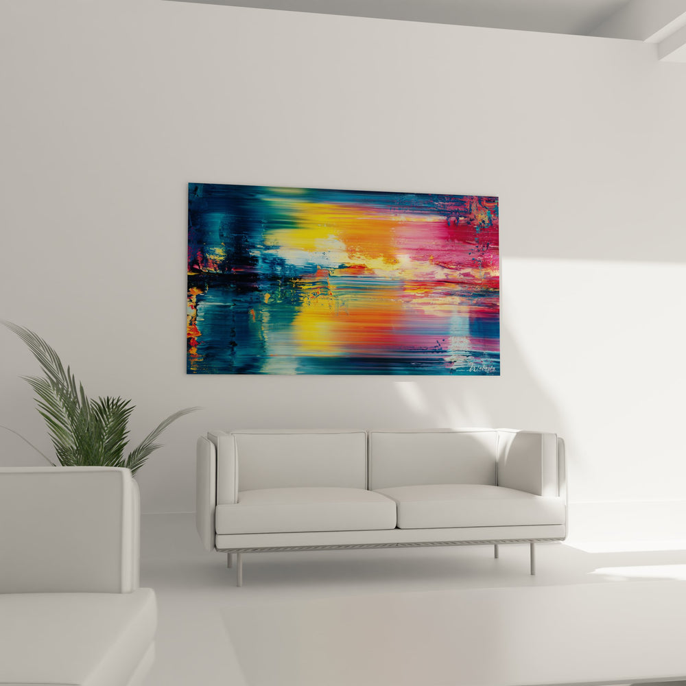 Ce tableau mural abstrait présente une composition dynamique où les couleurs s'entremêlent dans un ballet chromatique saisissant. L'œuvre révèle un art contemporain style raclé d'une rare intensité, où les bleus profonds dialoguent harmonieusement avec des jaunes lumineux et des rouges passionnés. La technique du raclage crée des effets de matière uniques, générant des dégradés colorés abstraits qui captent et reflètent la lumière de manière exceptionnelle. Les mouvements horizontaux et verticaux s'entrecroisent, formant une géométrie libre qui évoque à la fois la fluidité de l'eau et l'énergie du feu. Cette peinture abstraite moderne transforme l'espace par sa présence magnétique, offrant une expérience visuelle renouvelée à chaque regard. Les superpositions de couleurs créent une profondeur remarquable, tandis que les zones de transparence ajoutent une dimension poétique à l'ensemble. Ce tableau décoratif abstrait s'impose comme une pièce maîtresse capable d'illuminer et de dynamiser n'importe quel intérieur contemporain.