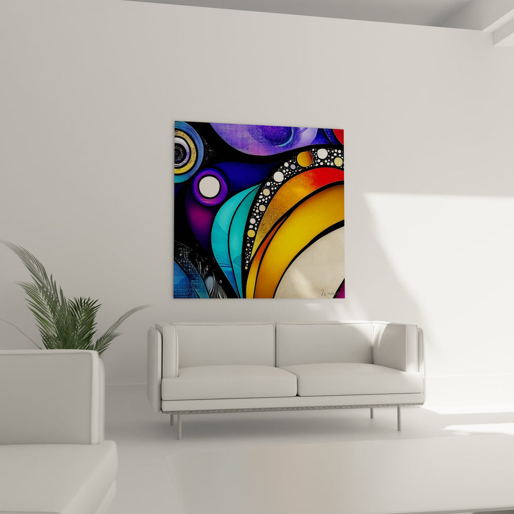 Ce tableau mural abstrait présente une composition dynamique inspirée de l'art des vitraux contemporains. L'œuvre se caractérise par un agencement harmonieux de formes géométriques courbes et de motifs organiques qui s'entremêlent dans un ballet visuel captivant. Les cercles concentriques dominent la partie gauche de la composition, créant un point focal saisissant avec leurs nuances de bleu, violet et or. La technique de superposition rappelle les vitraux modernes où chaque élément coloré trouve sa place dans l'ensemble. Au centre, une bande parsemée de motifs ponctuels blancs et colorés fait la transition vers la partie droite où dominent les tons chauds orangés et dorés. Cette décoration murale artistique révèle une maîtrise parfaite des contrastes chromatiques et des jeux de lumière, caractéristiques essentielles de l'art du vitrail transposé sur toile. Les formes organiques s'épanouissent librement, créant un mouvement fluide qui guide naturellement le regard à travers l'ensemble de la composition. Cette œuvre d'art contemporaine transforme l'espace en lui apportant une dimension spirituelle et contemplative, propre aux plus beaux vitraux d'églises réinterprétés dans un langage artistique moderne.