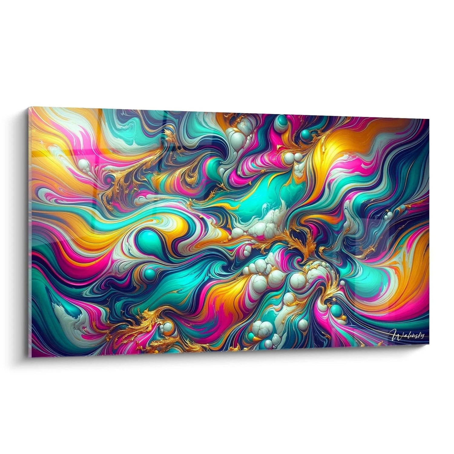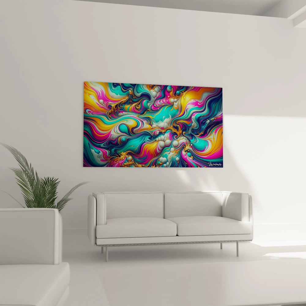 Ce tableau est une symphonie de couleurs qui dansent et se mêlent avec une grâce hypnotique. Les nuances éclatantes de turquoise, de jaune et de rose créent une palette vibrante, sublimée par des touches dorées qui apportent une lueur délicate, presque magique. En observant cette composition, vous ressentez la fluidité d’une rivière d’émotions, un flux harmonieux où chaque courbe et chaque tourbillon révèle une histoire, une énergie en perpétuelle évolution.