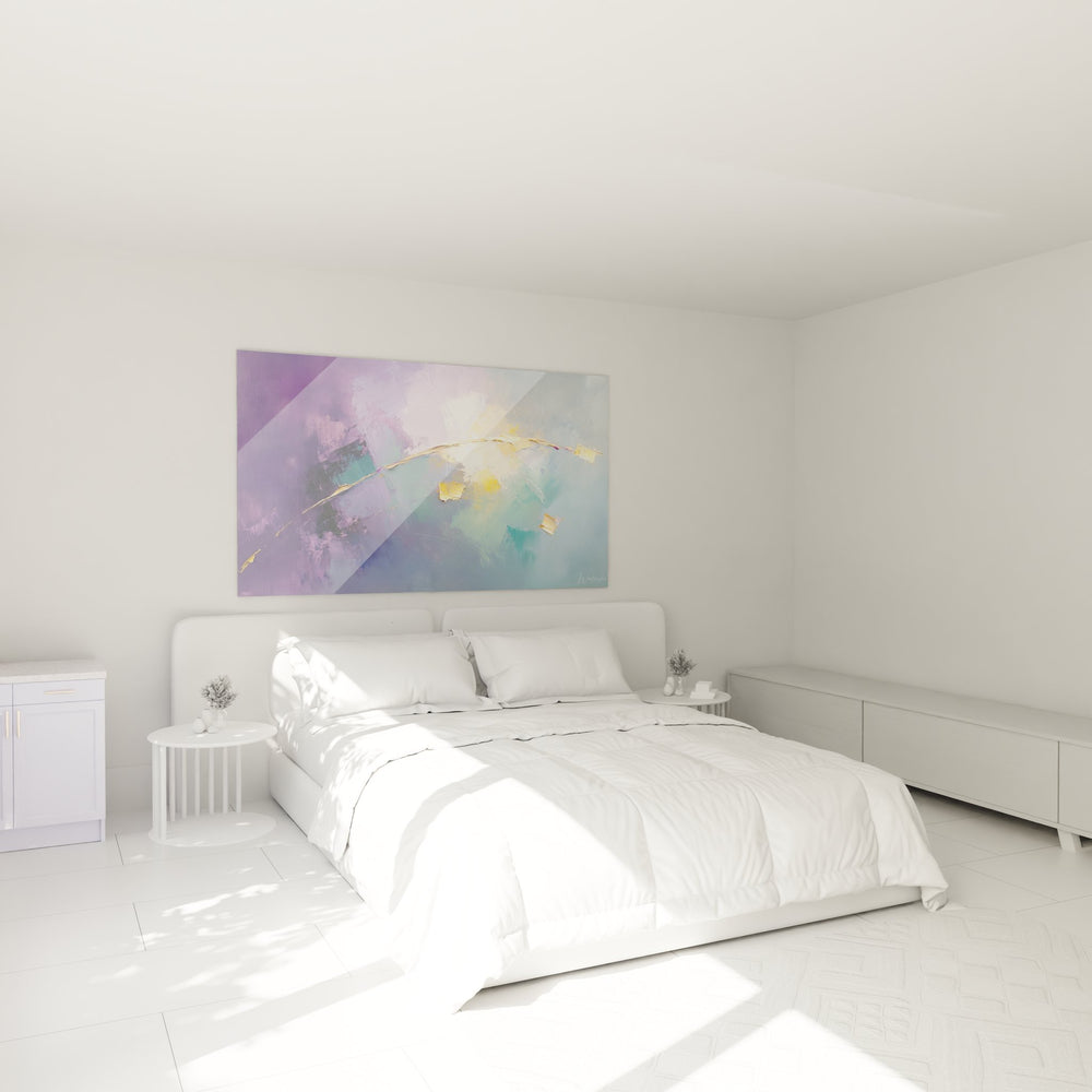 Ce tableau abstrait dynamique présente une composition saisissante où les formes géométriques s'entremêlent dans un ballet de couleurs harmonieux. L'œuvre se caractérise par un mouvement fluide qui traverse la toile de gauche à droite, créant une sensation de convergence lumineuse au centre de la composition. Les tons violets profonds dominent la partie gauche du tableau mural abstrait, contrastant magnifiquement avec les nuances dorées et blanches qui illuminent la zone centrale. Cette peinture abstraite contemporaine révèle un jeu subtil de transparences et d'opacités, où les couches de peinture se superposent pour créer une profondeur visuelle remarquable. Les accents turquoise apportent une fraîcheur inattendue à l'ensemble, tandis que les touches dorées métalliques captent et reflètent la lumière de manière spectaculaire. Cette œuvre d'art moderne s'inscrit parfaitement dans l'esthétique contemporaine, offrant une décoration murale sophistiquée qui transforme instantanément l'atmosphère d'un espace. La technique picturale employée révèle une maîtrise des effets de matière, avec des empâtements qui créent un relief tactile et des glacis qui apportent une luminosité particulière à certaines zones de la toile.
