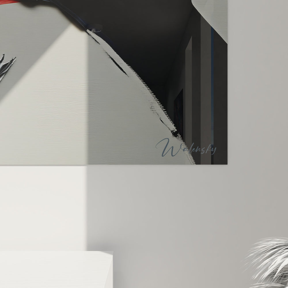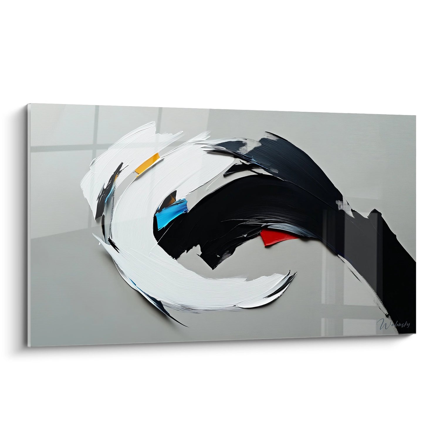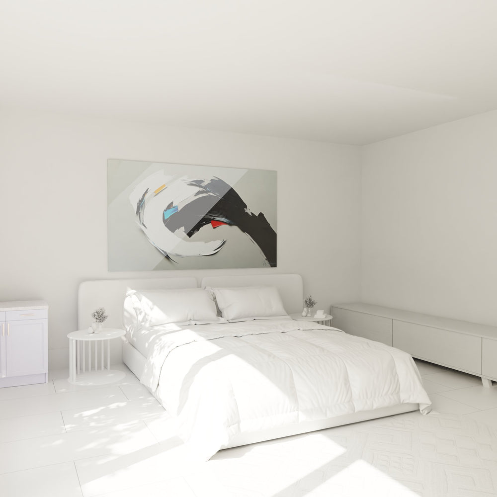 Ce tableau abstrait dynamique présente une composition saisissante dominée par un mouvement circulaire puissant. L'œuvre se caractérise par des formes courbes abstraites qui créent une sensation de rotation et d'élan perpétuel sur la toile. Les coups de pinceau expressifs en noir et blanc forment une spirale élégante, ponctuée de touches colorées subtiles - un éclat de bleu turquoise et une pointe de rouge vermillon qui viennent dynamiser l'ensemble. Cette peinture murale contemporaine exploite la technique de l'empâtement pour créer une texture riche et tactile, donnant une dimension sculpturale à la surface. Le fond gris neutre permet aux éléments gestuels abstraits de se détacher avec force, créant un contraste saisissant. L'artiste maîtrise parfaitement l'équilibre entre mouvement et stabilité, offrant une décoration murale sophistiquée qui capte immédiatement l'attention. Cette œuvre d'art minimaliste moderne s'inscrit dans la lignée de l'art gestuel contemporain, où chaque trait exprime une émotion brute et spontanée.