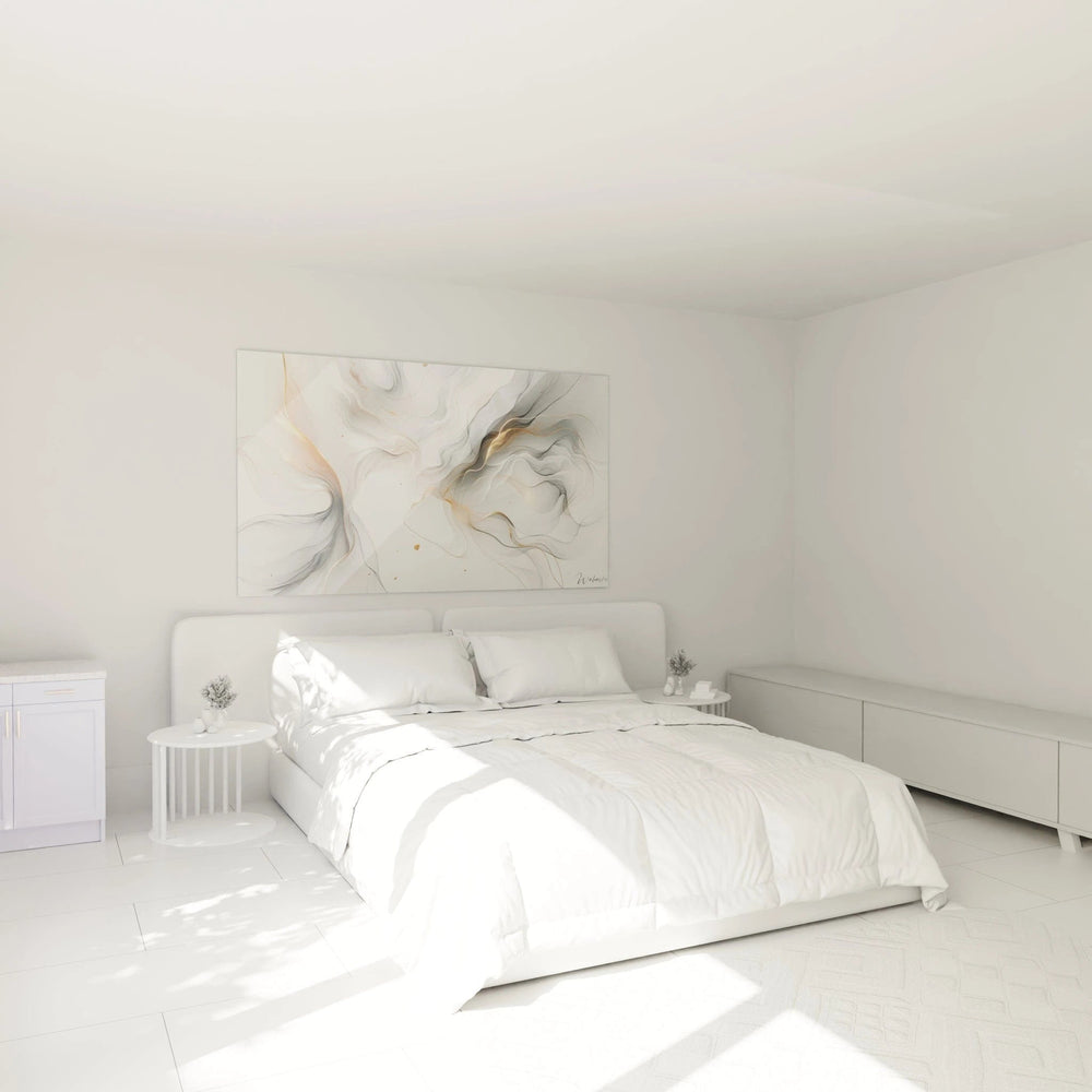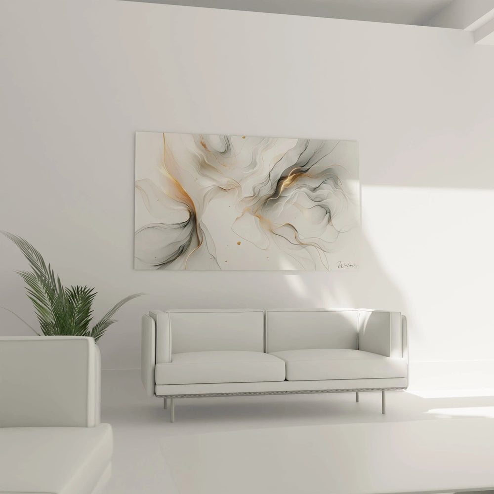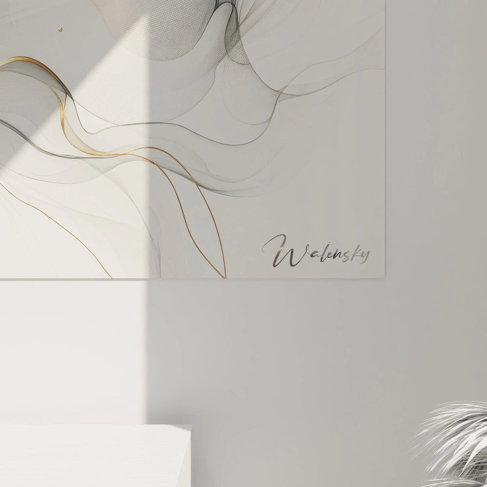 Imaginez une brise légère qui caresse votre peau, un murmure délicat suspendu dans le temps. Ce tableau capture cette essence éphémère grâce à ses lignes d’une fluidité exceptionnelle et ses éclats d’or scintillants, qui diffusent une lumière douce et enveloppante. Chaque trait doré agit comme une étincelle précieuse, illuminant subtilement l’ensemble et insufflant un sentiment de calme profond. Ce jeu de transparences et de nuances entre noir, gris et or crée une atmosphère raffinée, où la sophistication se mêle à la simplicité.