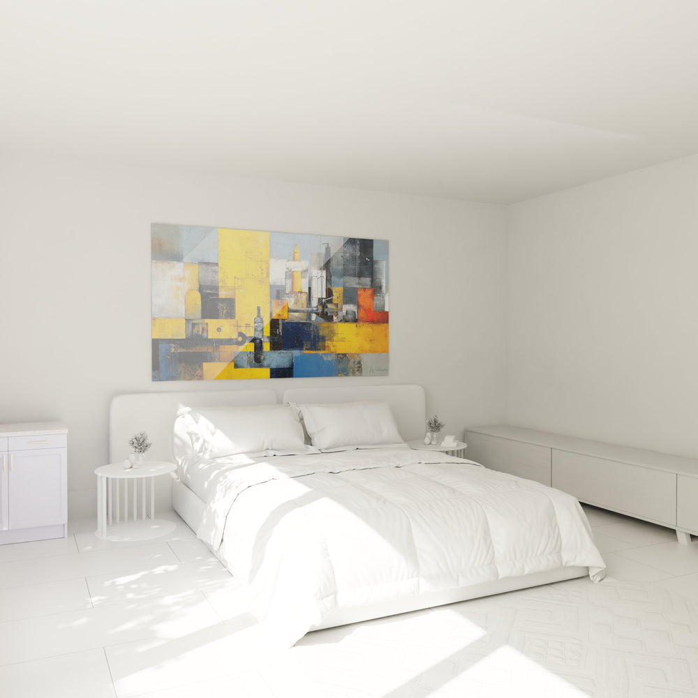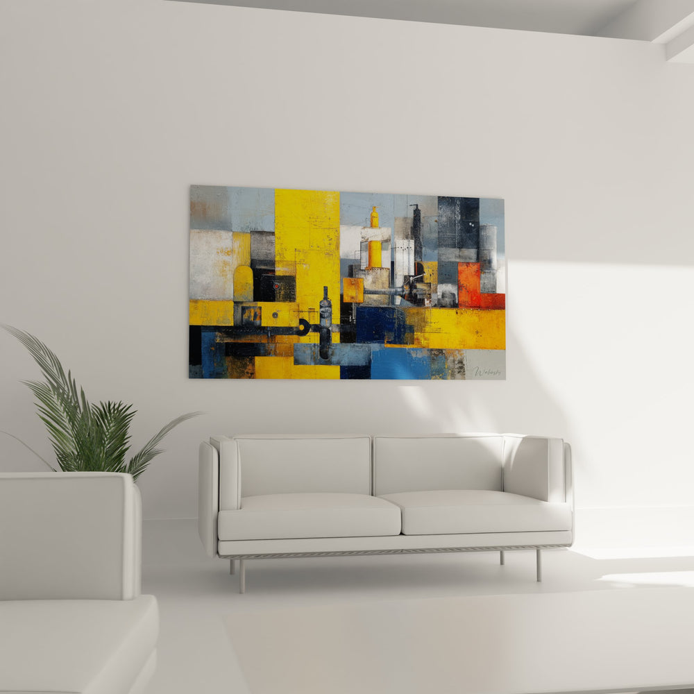Ce tableau mural abstrait industriel présente une composition géométrique fascinante qui évoque l'univers des structures mécaniques urbaines. L'œuvre se distingue par son assemblage de formes rectangulaires et carrées qui s'entremêlent dans un équilibre parfait entre ordre et chaos. Les éléments architecturaux stylisés rappellent les silhouettes de bâtiments industriels, de cheminées d'usines et de structures métalliques complexes. La technique picturale mélange habilement les textures lisses et rugueuses, créant un relief visuel qui confère à cette œuvre d'art industrielle contemporaine une profondeur remarquable. Les superpositions de couches et les effets de matière évoquent la patine du temps sur les installations mécaniques, tandis que certaines zones plus nettes suggèrent la précision technique des équipements industriels modernes. Cette peinture abstraite géométrique capture l'essence de l'esthétique industrielle tout en proposant une interprétation artistique raffinée de l'univers des machines.