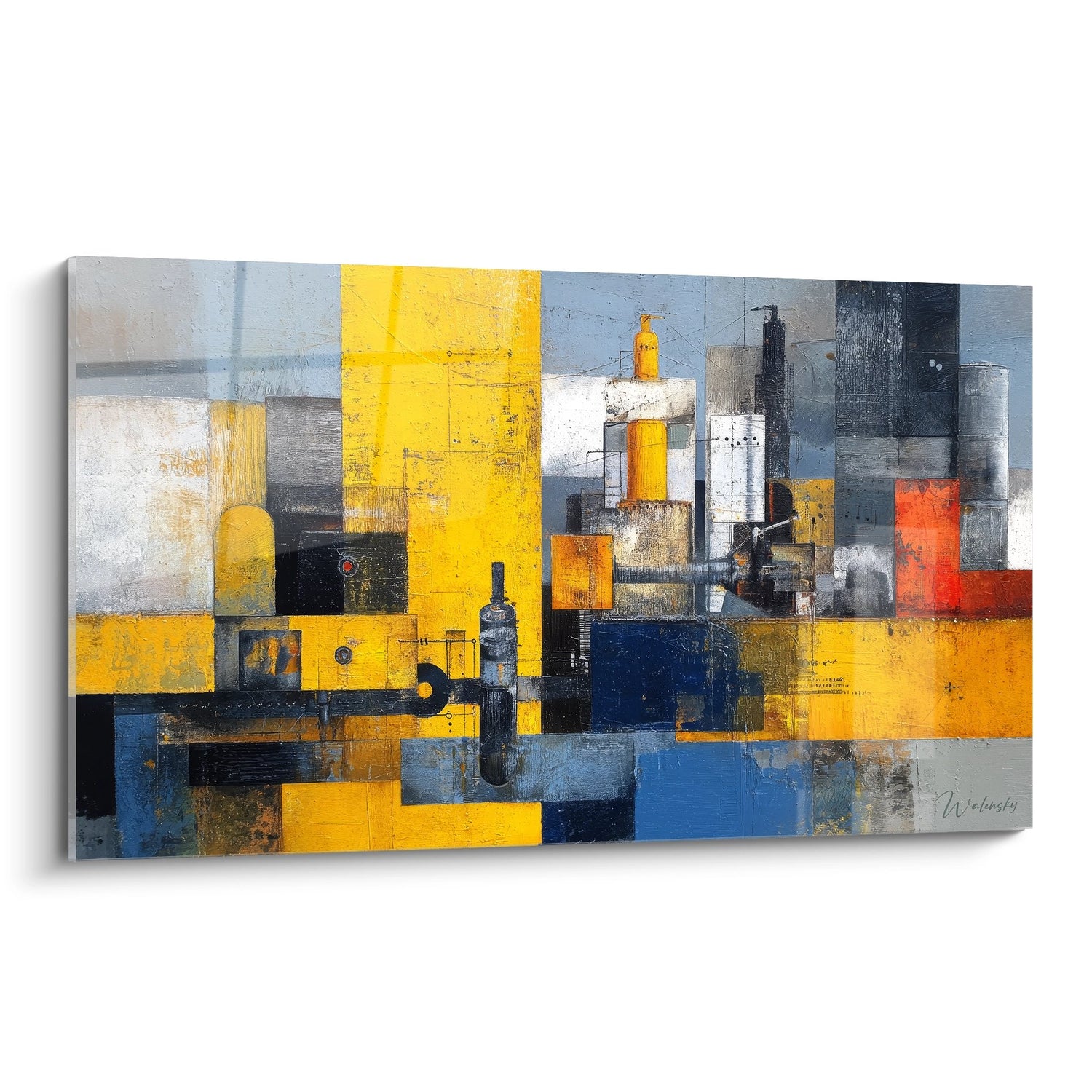 La palette chromatique industrielle de ce tableau s'articule autour d'un contraste saisissant entre les jaunes éclatants et les bleus profonds. Ces couleurs évoquent l'énergie des environnements de production mécanisée : le jaune symbolisant la chaleur des moteurs et la vitalité industrielle, tandis que le bleu représente la précision technique et la robustesse des systèmes d'engrenages. Les touches de rouge orangé apportent une dimension dynamique qui rappelle l'incandescence des métaux en fusion.