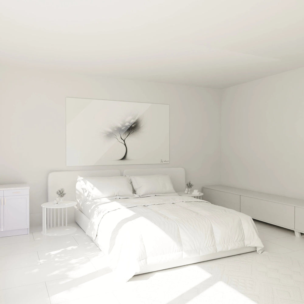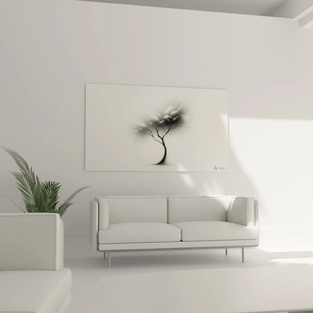 Exclusivement composé de nuances argentées, noires et blanches, ce tableau s’impose par son élégance dépouillée. Le contraste subtil entre ces tons souligne une pureté intemporelle, laissant l’arbre « respirer » dans un espace dégagé qui valorise chaque détail. La simplicité des formes épurées évoque le mouvement naturel, comme une danse silencieuse portée par une brise légère.
