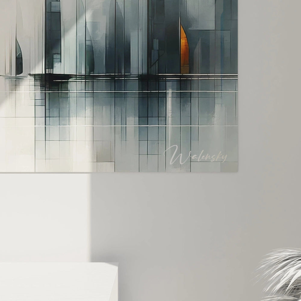 Ce tableau est bien plus qu’une simple image : c’est une invitation à l’évasion. Les formes géométriques, anguleuses et superposées, esquissent une mer en perpétuel mouvement, un océan d’horizons illimités. Les nuances argentées et grises apportent une fraîcheur iodée, tandis que les touches d’or diffusent une lumière chaude, telle une promesse d’aube nouvelle. Chaque regard posé sur l’œuvre dévoile un nouvel angle, une nouvelle histoire que votre imagination complète avec délicatesse.