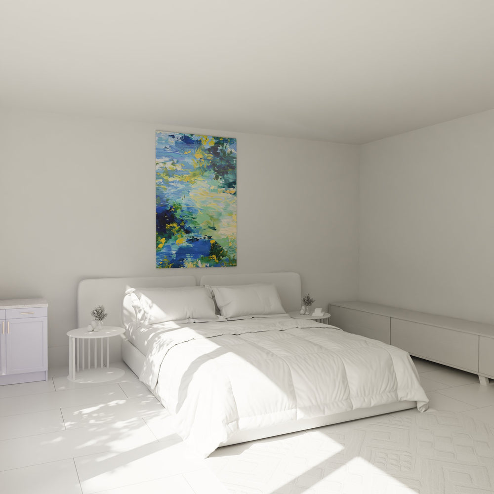 Ce tableau mural abstrait capture l'essence tumultueuse de l'océan à travers une approche expressionniste audacieuse. Les nuances de bleu dominent la composition, allant du bleu profond marine aux tons céruléens les plus délicats, créant un véritable paysage abstrait maritime. L'artiste a appliqué la peinture avec une gestuelle libre et spontanée, caractéristique du mouvement expressionniste, où chaque coup de pinceau traduit une émotions brute. Les empâtements créent des reliefs qui accrochent la lumière, donnant une dimension tactile à cette œuvre d'art moderne. Les touches de jaune et d'orange viennent ponctuer cette symphonie aquatique, évoquant les reflets dorés du soleil sur les vagues. Cette peinture expressionniste contemporaine révèle différentes lectures selon l'angle d'observation : tantôt tempête océanique, tantôt calme méditerranéen. La technique picturale rappelle les maîtres de l'art moderne qui ont révolutionné la représentation de la nature. Ce tableau décoratif bleu s'impose comme une fenêtre ouverte sur un monde aquatique imaginaire, où la réalité se mélange à l'interprétation artistique pour créer une décoration murale expressionniste unique.