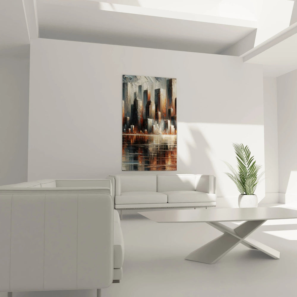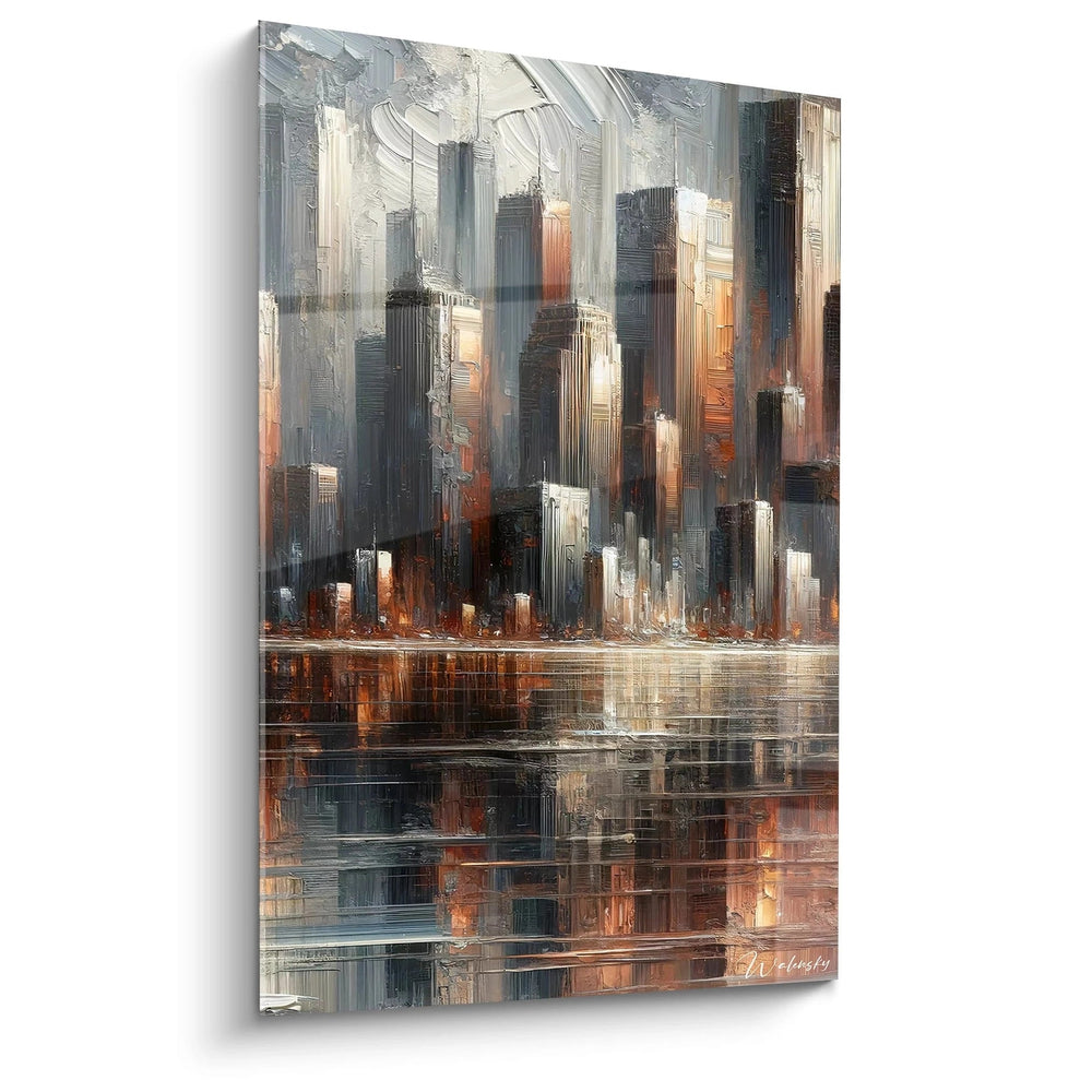 Ce tableau raconte une histoire : celle d’une ville en perpétuel essor, où chaque édifice symbolise la quête humaine d’altitude et de nouveauté, mais aussi la beauté fragile des instants suspendus. Là où la lumière danse sur l’eau, le calme et le tumulte urbain se rencontrent, vous invitant à une pause contemplative au cœur du rythme frénétique de la vie moderne.