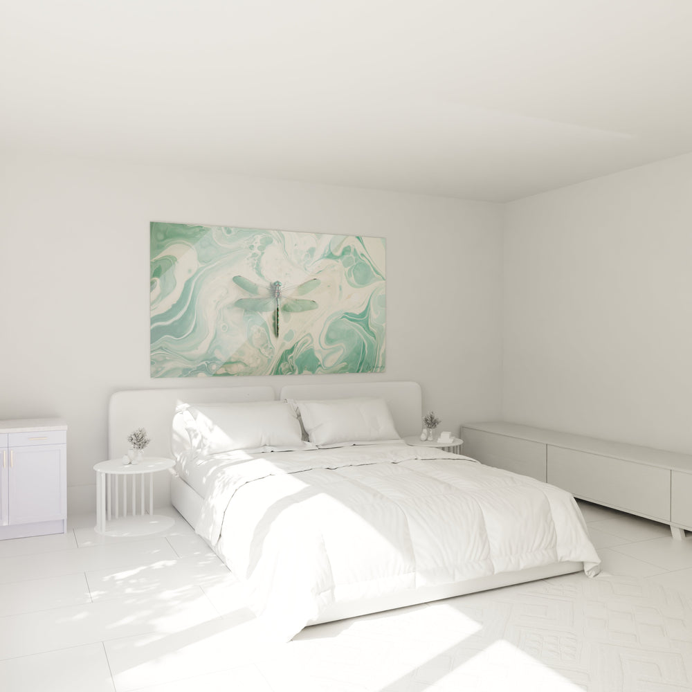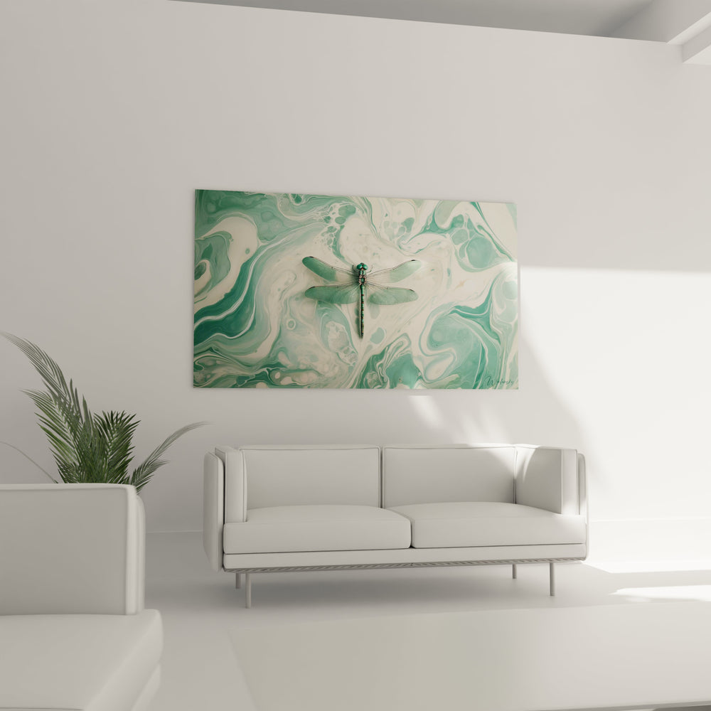 La technique raffinée employée offre un fond marbré où les couleurs se mêlent avec fluidité, capturant la lumière et jouant avec les ombres pour créer une profondeur fascinante dans votre intérieur. La libellule, subtilement mise en valeur, agit comme un point d’ancrage poétique dans ce tableau à la fois abstrait et organique. Son allure fragile et gracieuse est symbole de transformation et de légèreté, conférant à votre pièce un souffle d’inspiration et d’espoir.