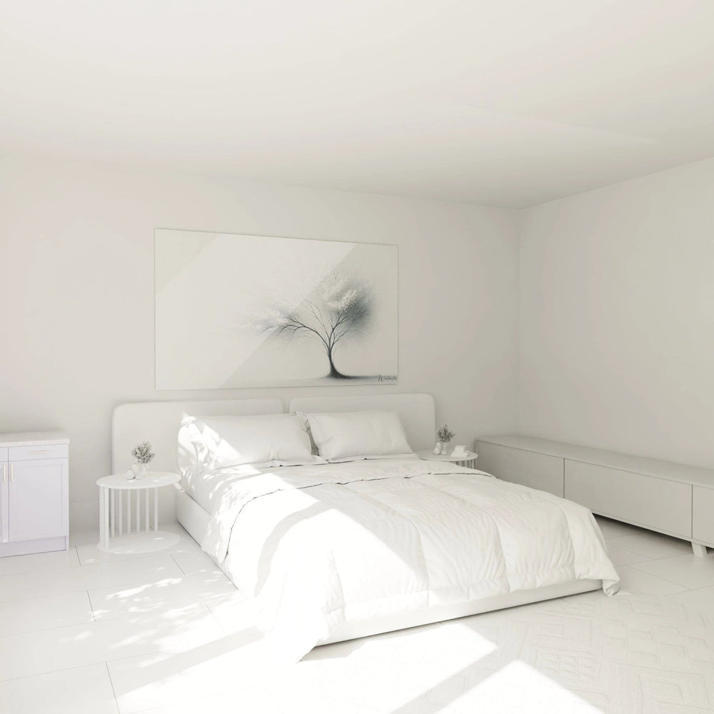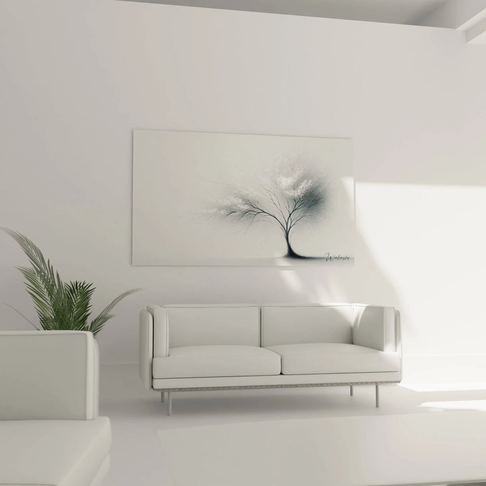 Ce tableau incarne la force tranquille d’un arbre solitaire, dont la silhouette noire se détache avec finesse sur un fond immaculé. Il reflète la dualité fascinante entre fragilité et résilience, rappelant que la simplicité peut être d’une puissance subtile et profonde. En observant les lignes délicates de ses branches, vous percevez presque le souffle léger du vent, cette pulsation intime qui anime la nature dans son expression la plus pure.