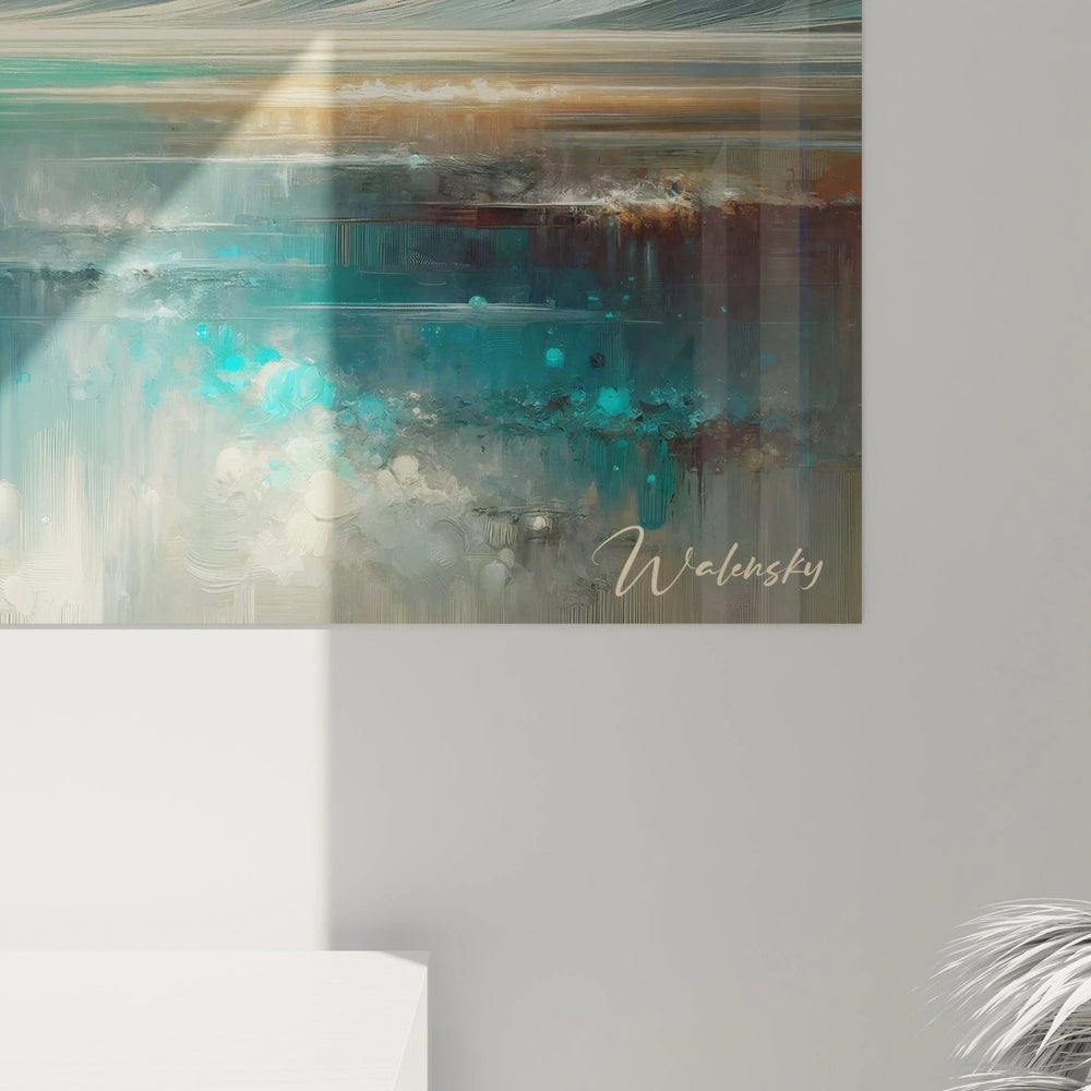 Ce tableau n’est pas qu’une simple décoration : c’est un véritable sanctuaire visuel. En observant ses nuances de bleu profond, de vert émeraude et ces touches délicates de beige doré, vous ressentez la puissance d’un océan déchaîné pourtant enveloppé d’une lumière bienveillante. Cette harmonieuse confrontation entre énergie brute et paix intérieure vous offre un point de fuite vers l’infini, un espace où le tumulte devient contemplation.