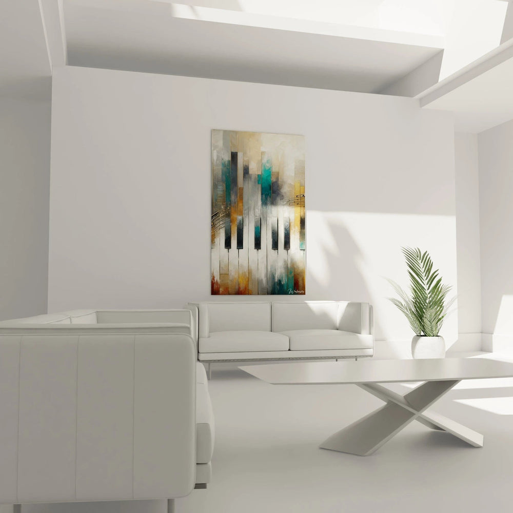 Imaginez-vous face à un piano qui se dissout en vagues éthérées, chaque touche portée par un souffle de turquoise, de doré chatoyant et de beige délicat. Ce tableau saisit la magie des harmonies mouvantes, évoquant la fluidité d’une symphonie urbaine où chaque note se fond dans l’air comme un murmure. Par son jeu d’ombres et de lumières, il rend visible l’invisible, transmettant l’intensité vibrante d’une composition musicale sans produire un seul son.