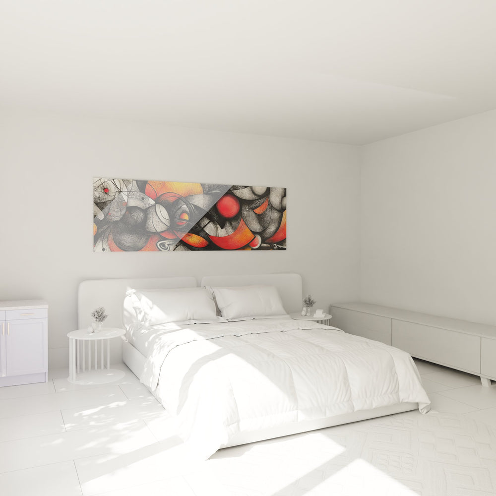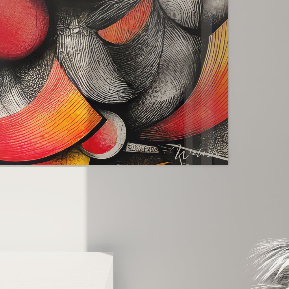 La palette chromatique rouge orange évoque la chaleur cosmique et l'énergie créatrice. Les nuances flamboyantes contrastent avec les zones grises et noires, créant une tension visuelle captivante. Cette composition artistique bicolore symbolise le mouvement perpétuel de l'univers et la dualité entre ordre et chaos. Les tons chauds apportent dynamisme et passion à l'ensemble.