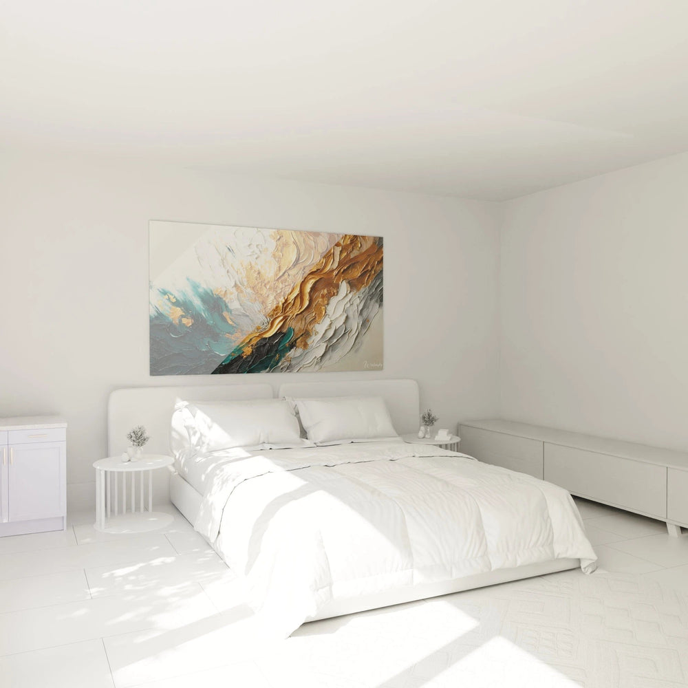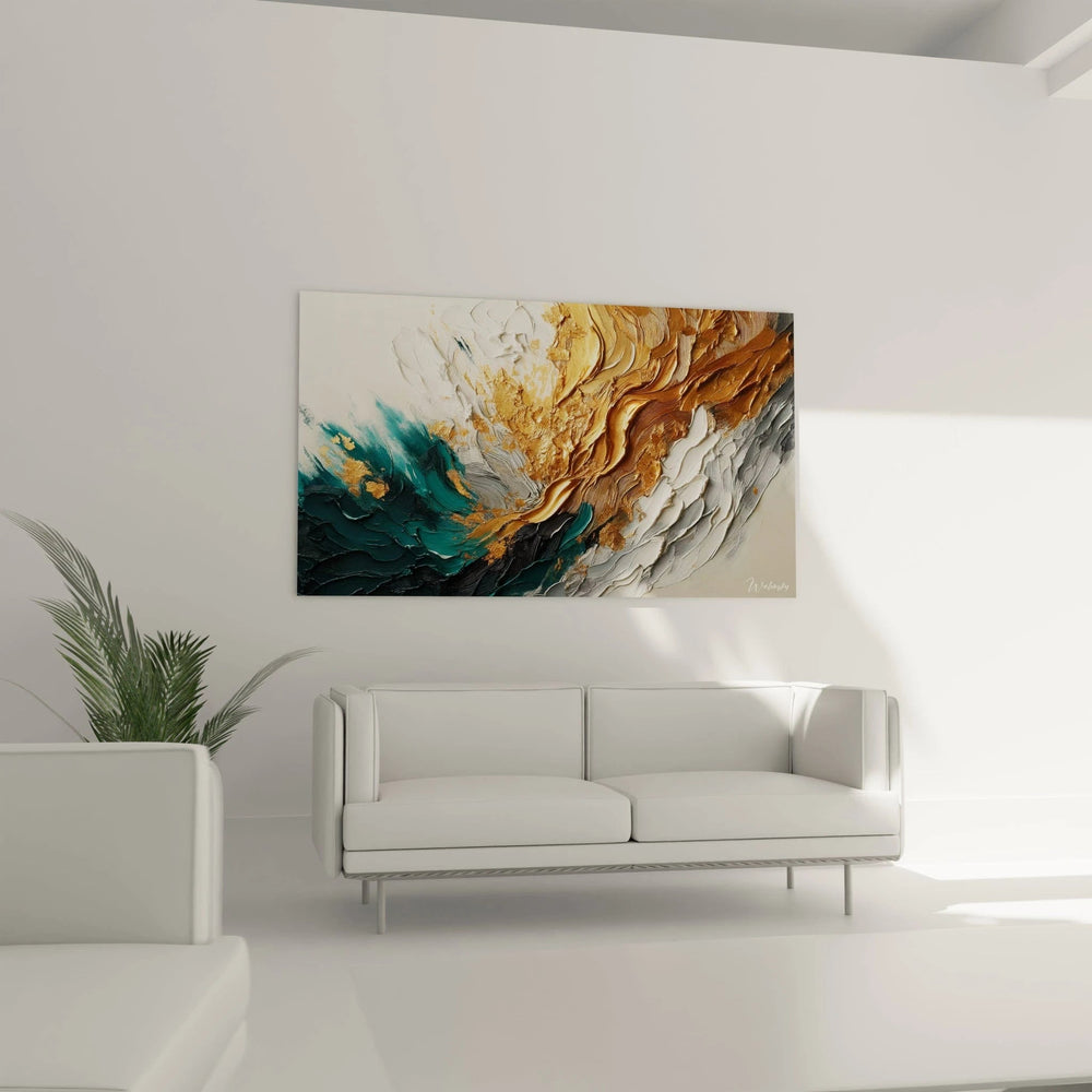 Plus qu’un simple élément décoratif, ce tableau est une expérience sensorielle. Sa présence apporte une énergie positive qui apaise, tout en évoquant la splendeur d’un paysage abstrait en perpétuel mouvement. L’alliance du vert et de l’or crée un contraste élégant qui valorise aussi bien un intérieur contemporain qu’un espace plus classique.