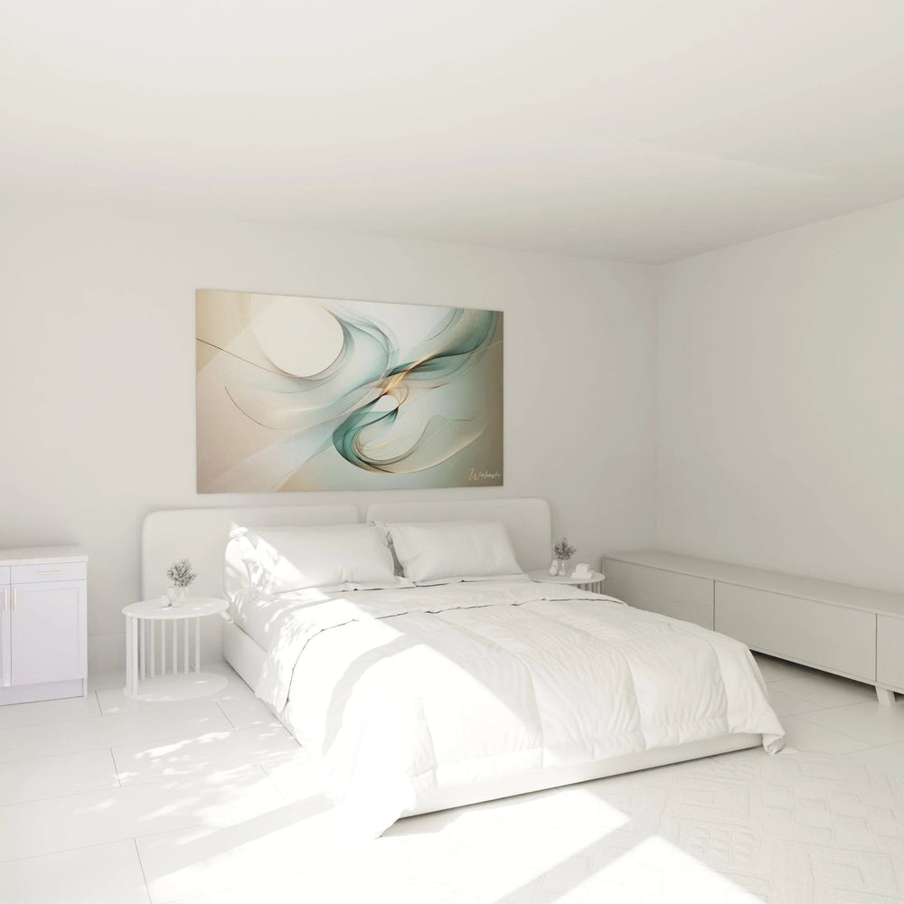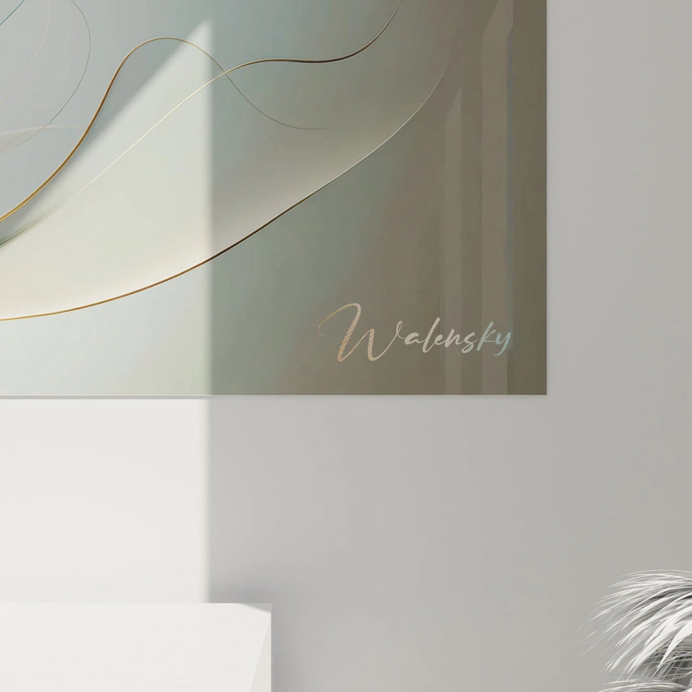 Imaginez la caresse du vent sur votre peau, l’évanescence d’une onde lumineuse glissant doucement sur une surface lisse. Ce tableau traduit cette sensation intangible en courbes fluides et légères, effleurant l’espace comme un souffle d’air. L’or délicatement déposé illumine l’ensemble d’une douce lueur chaleureuse, tandis que les nuances de vert tendre et beige apportent une touche organique et apaisante au regard.