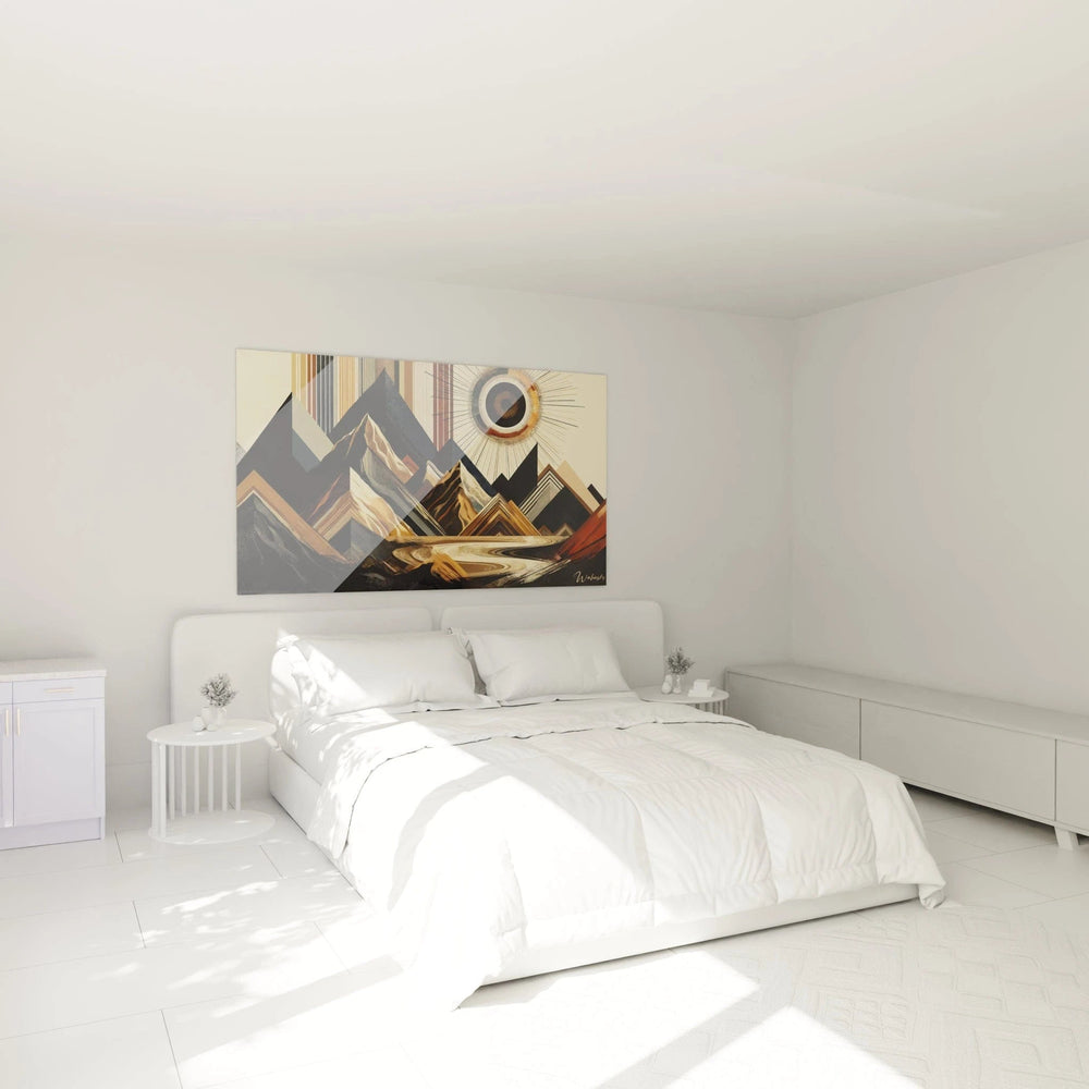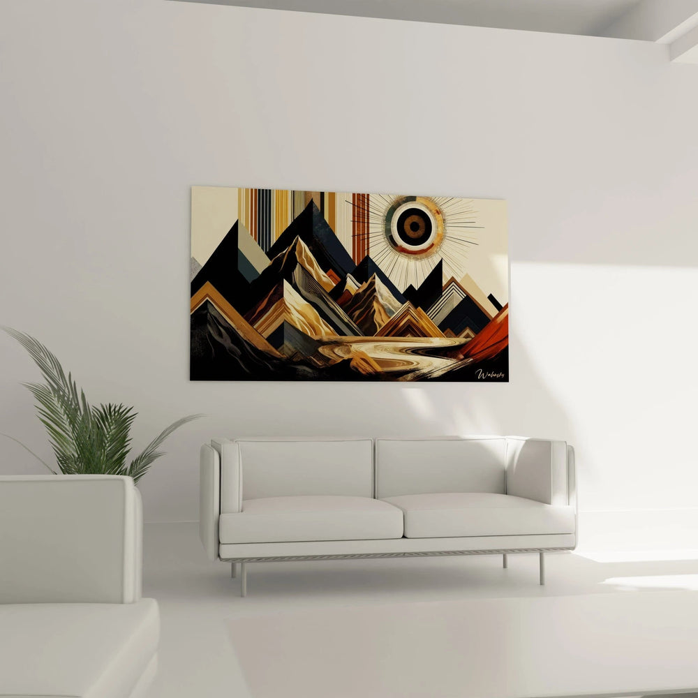 Ce tableau transcende les simples formes décoratives pour devenir un symbole vibrant de solidité et d’énergie. Les silhouettes géométriques des montagnes, mêlées à des rayons solaires en éventail, évoquent à la fois la stabilité de la terre et la vitalité de la lumière traversant chaque vallée. Ce jeu harmonieux entre lignes rigides et courbes fluides révèle un équilibre subtil qui capte l’essence même de l’Afrique abstraite. Vous ressentez alors cette connexion profonde entre l’univers et votre espace, une invitation à l’élévation intérieure.