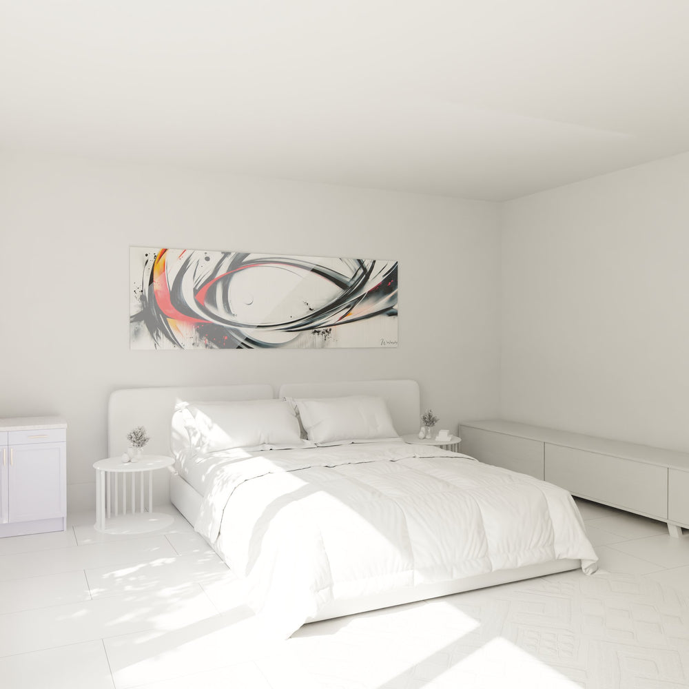 Ce tableau mural abstraite présente une composition dynamique centrée sur un mouvement fluide aux courbes élégantes et organiques. L'œuvre se développe sur un format panoramique, créant un tourbillon artistique qui évoque la fluidité et la grâce du mouvement naturel. Les lignes noires puissantes dessinent des courbes serpentines qui s'entrelacent harmonieusement, créant une spirale décorative hypnotique au centre de la composition. Cette peinture abstraite moderne joue sur les contrastes entre les zones de couleur et les espaces négatifs blancs, offrant une respiration visuelle caractéristique du style minimaliste. Les éléments graphiques s'étendent de manière asymétrique, créant un équilibre dynamique qui guide naturellement le regard vers le centre de l'œuvre. Cette décoration murale contemporaine s'inscrit parfaitement dans l'esthétique minimaliste tout en apportant une dimension énergique à l'espace. L'art mural minimaliste trouve ici une expression particulièrement réussie, alliant simplicité formelle et complexité visuelle dans un dialogue harmonieux entre mouvement et statisme.