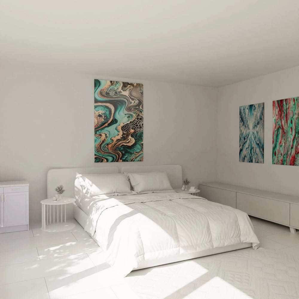 Chaque mouvement, chaque nuance évoque l’équilibre fragile entre chaos et harmonie que l’on observe dans la nature. Ce tableau vous offre une fenêtre ouverte sur les courants marins, les formations minérales et les motifs organiques que l’on découvre dans les abîmes. Plus qu’un simple décor, il est une histoire visuelle, une invitation à explorer, rêver et ressentir le calme apaisant des fonds océaniques.