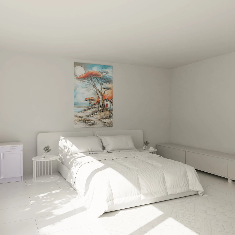 L'unicité de cette œuvre acacia authentique réside dans sa capacité à fusionner paysage naturel et patrimoine architectural africain. Contrairement aux représentations classiques d'acacias isolés, cette composition intègre harmonieusement l'habitat humain traditionnel. Les détails distinctifs incluent la porte rouge vif qui ponctue la neutralité des murs blancs, créant un accent visuel remarquable. La présence du point d'eau avec ses reflets ajoute une dimension contemplative rare. Les proportions respectent l'échelle réelle, où l'arbre domine sans écraser l'architecture. Cette art mural acacia village capture un moment de vie quotidienne figé dans le temps, évoquant la cohabitation séculaire entre nature et culture en Afrique.