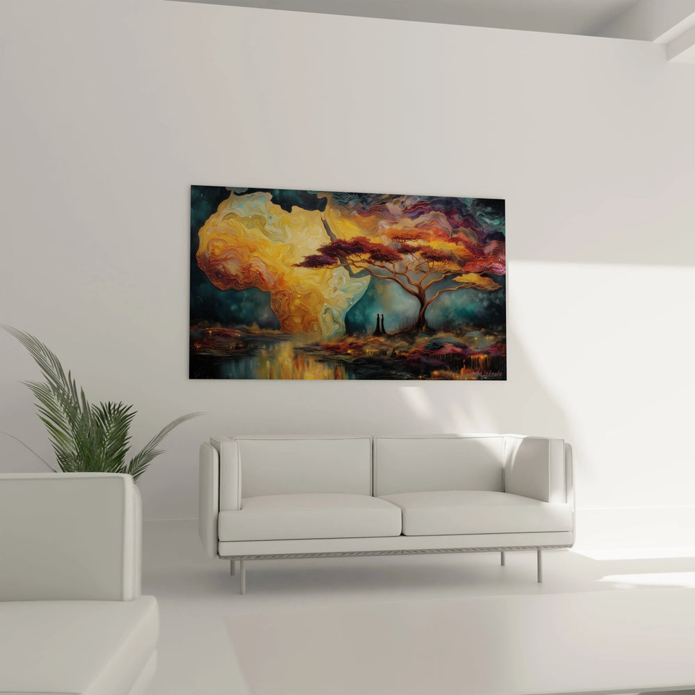 Ce tableau acacia présente une vision surréaliste et captivante d'un arbre emblématique de la savane africaine. L'œuvre se distingue par son tableau acacia stylisé moderne où les formes organiques se mêlent aux couleurs flamboyantes. Deux silhouettes humaines se dressent sous l'arbre, créant une perspective saisissante qui invite à la contemplation. Le ciel dramatique, composé de nuages tourbillonnants aux teintes dorées et pourpres, transforme cette décoration murale acacia en une fenêtre vers un monde onirique. Les reflets chatoyants sur ce qui semble être une étendue d'eau au premier plan ajoutent une dimension mystique à l'ensemble.