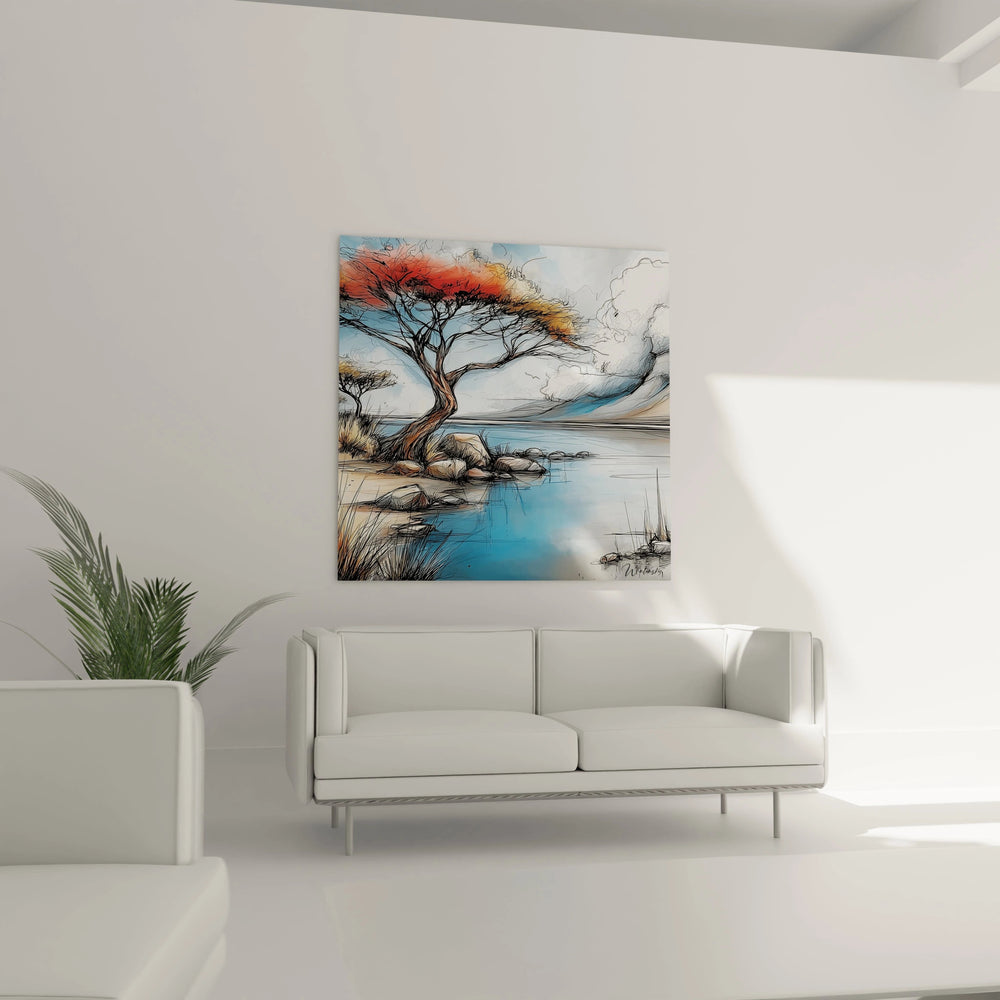 Cette œuvre présente un tableau acacia majestueux aux couleurs flamboyantes qui domine un paysage aquatique serein. L'arbre emblématique se dresse avec fierté, sa couronne rouge-orangée contrastant magnifiquement avec les tons bleus apaisants de l'eau. Ce tableau acacia savane africaine capture l'essence même de la beauté sauvage avec ses branches élégamment courbées et son tronc sculpté par le temps. La technique de dessin au trait noir définit parfaitement chaque détail, créant une harmonie visuelle saisissante entre la terre ocre et le ciel nuageux.