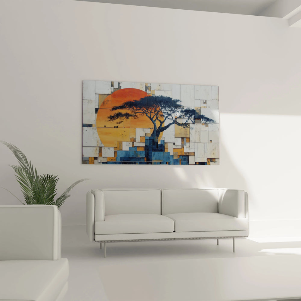 Ce tableau acacia présente une approche artistique révolutionnaire qui fusionne l'iconique arbre africain avec une esthétique contemporaine fragmentée. L'œuvre se distingue par sa composition en mosaïque de carrés géométriques qui encadrent majestueusement l'acacia silhouetté. Cette décoration murale acacia moderne captive immédiatement par son contraste saisissant entre tradition et modernité. Le soleil orangé qui embrase l'arrière-plan confère à cette œuvre acacia contemporaine une dimension émotionnelle puissante, évoquant les couchers de soleil légendaires de la savane africaine. La technique mixte visible combine habilement réalisme figuratif et abstraction géométrique.