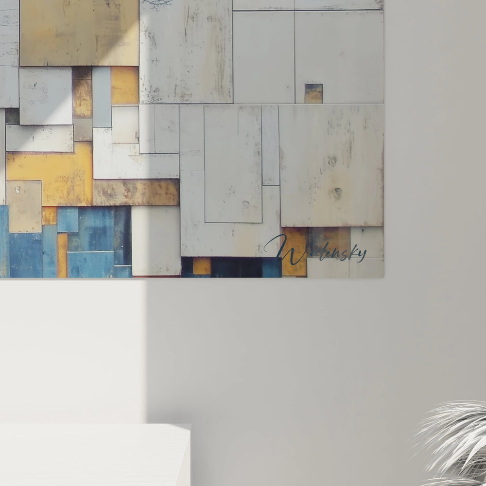 L'examen rapproché de ce tableau acacia texture mixte révèle une richesse technique remarquable. Les surfaces présentent diverses textures qui enrichissent l'expérience tactile visuelle : certains carrés affichent un aspect lisse et mat, d'autres révèlent des micro-reliefs subtils. Les effets de lumière sont particulièrement sophistiqués, avec des ombres portées calculées entre les différents plans géométriques. La technique artistique semble combiner peinture traditionnelle et éléments numériques, créant des transitions fluides entre zones figuratives et abstraites. Cette art mural acacia relief moderne exploite habilement les jeux d'ombres et de lumières pour donner vie aux fragments géométriques. La densité des détails varie intelligemment selon les zones, concentrant l'attention sur l'arbre central.