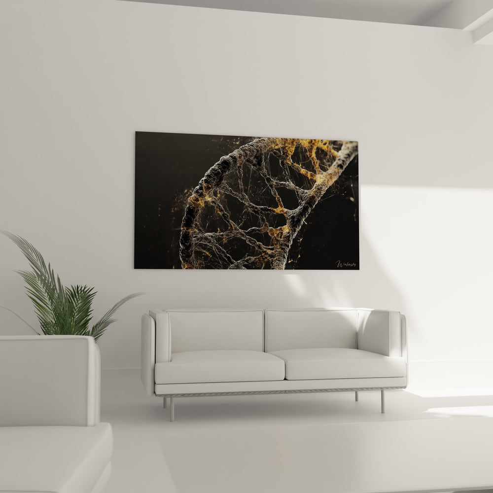 Ce tableau mural ADN présente une représentation saisissante de la double hélice génétique dans une version artistique exceptionnelle. L'œuvre capture la structure moléculaire de l'ADN avec un réalisme scientifique remarquable, où chaque brin de la hélice ADN dorée semble vibrer de vie et d'énergie. Les détails microscopiques sont magnifiés et sublimés, transformant cette merveille de la nature en une véritable décoration murale scientifique. La texture rugueuse et organique de la structure génétique contraste magnifiquement avec l'arrière-plan sombre et moderne, créant une profondeur visuelle captivante. Ce tableau art génétique révèle la beauté cachée de notre patrimoine génétique, transformant la science en art décoratif. L'artiste a su capturer l'essence même de la vie à travers cette représentation de l'ADN décoratif moderne. Les fibres entrelacées de la double hélice semblent presque palpables, invitant le spectateur à contempler les mystères de la génétique. Cette œuvre d'art ADN contemporaine s'inscrit parfaitement dans les tendances actuelles de l'art scientifique, où la beauté naturelle rencontre l'esthétique moderne pour créer des pièces uniques et fascinantes.