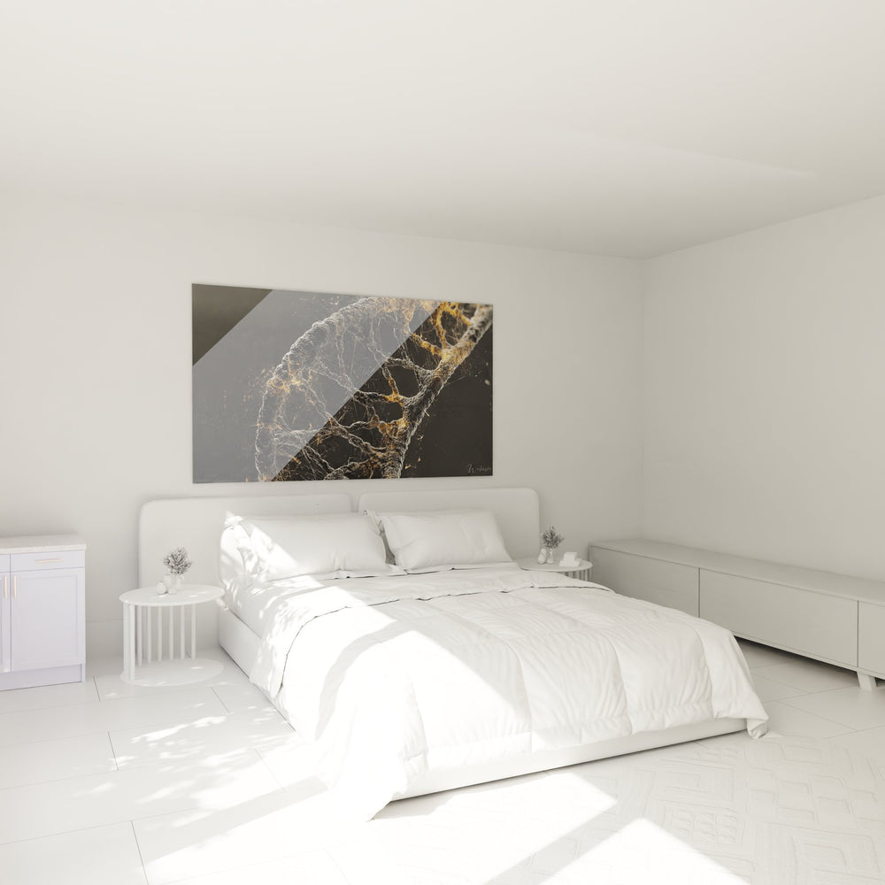 La palette chromatique de ce tableau génétique doré joue sur les contrastes entre les tons dorés lumineux et les nuances sombres profondes. Les reflets dorés symbolisent la préciosité de notre code génétique, véritable trésor de l'humanité. Cette art mural ADN lumineux évoque la sophistication scientifique tout en conservant une esthétique accessible et décorative, parfaite pour sublimer un intérieur moderne et contemporain.