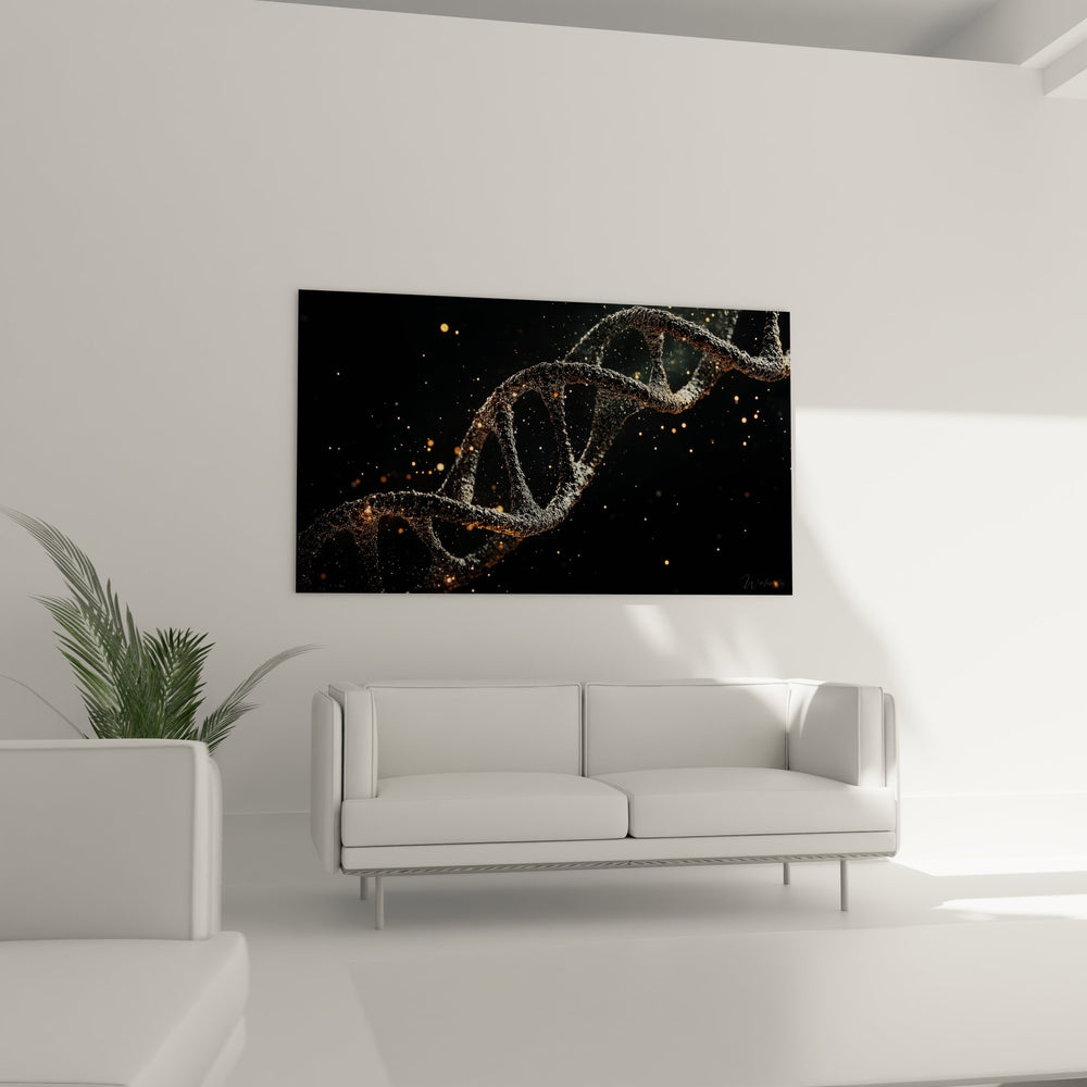 Ce tableau mural ADN présente une représentation saisissante d'une double hélice génétique baignée dans un éclat doré mystérieux. L'œuvre capture la beauté intrinsèque de la structure moléculaire de l'ADN à travers un rendu artistique moderne et sophistiqué. La hélice ADN dorée semble flotter dans un espace sombre parsemé de particules lumineuses, créant un effet de profondeur et de mouvement qui hypnotise le regard. Les brins de la double hélice sont délicatement texturés, révélant chaque détail de cette architecture moléculaire fondamentale. Ce tableau génétique moderne transforme un concept scientifique complexe en une œuvre d'art accessible et esthétiquement remarquable. L'arrière-plan architectural avec ses lignes géométriques contraste harmonieusement avec la forme organique de l'ADN, symbolisant la rencontre entre nature et technologie. Cette décoration murale scientifique s'adresse aux passionnés de biologie, aux professionnels de la santé, mais aussi à tous ceux qui apprécient l'art contemporain inspiré par la science. L'effet de particules dorées scintillantes évoque la magie de la vie elle-même, encodée dans ces brins moléculaires qui portent l'information génétique de tous les êtres vivants.