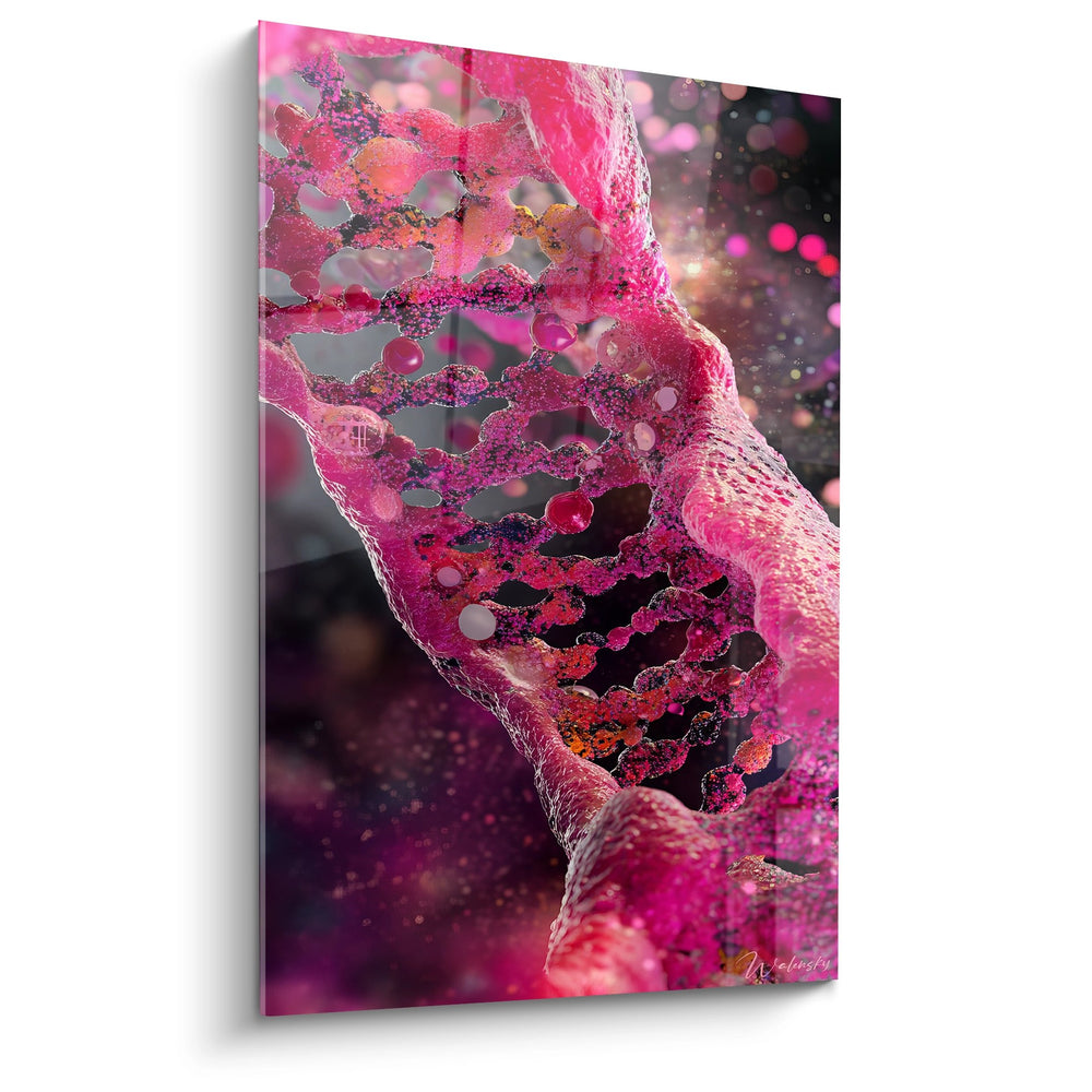 La palette de roses vibrants et de magentas lumineux évoque la vitalité et l'énergie de la vie. Ces couleurs génétiques artistiques symbolisent la féminité, la créativité et la régénération cellulaire. Les nuances chaudes créent une atmosphère accueillante tout en préservant le caractère scientifique de l'œuvre. Les particules scintillantes rappellent l'infiniment petit et la complexité de notre héritage génétique.