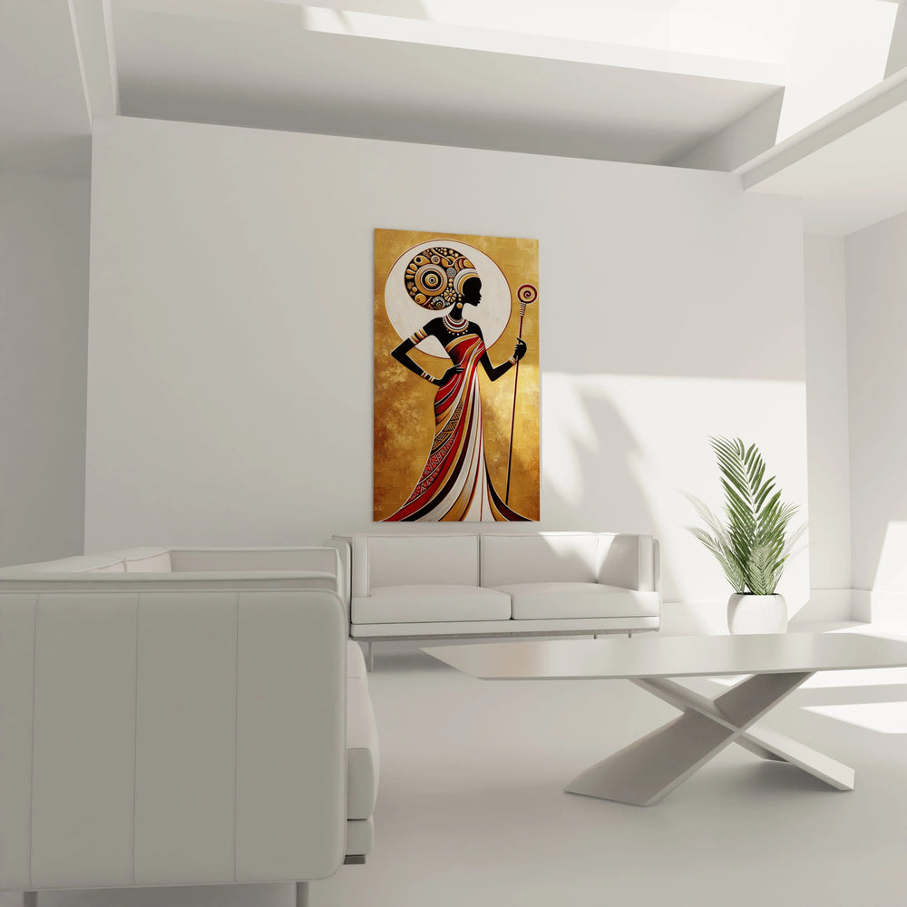 Ce tableau dégage une aura unique grâce à la silhouette élancée d’une femme couronnée d’une coiffe richement ornée, symbole des reines et matriarches honorées depuis des générations. Imaginez la lumière dorée du soleil enveloppant son contour, apportant une sensation chaleureuse et sacrée, comme une invitation à la contemplation et au respect.