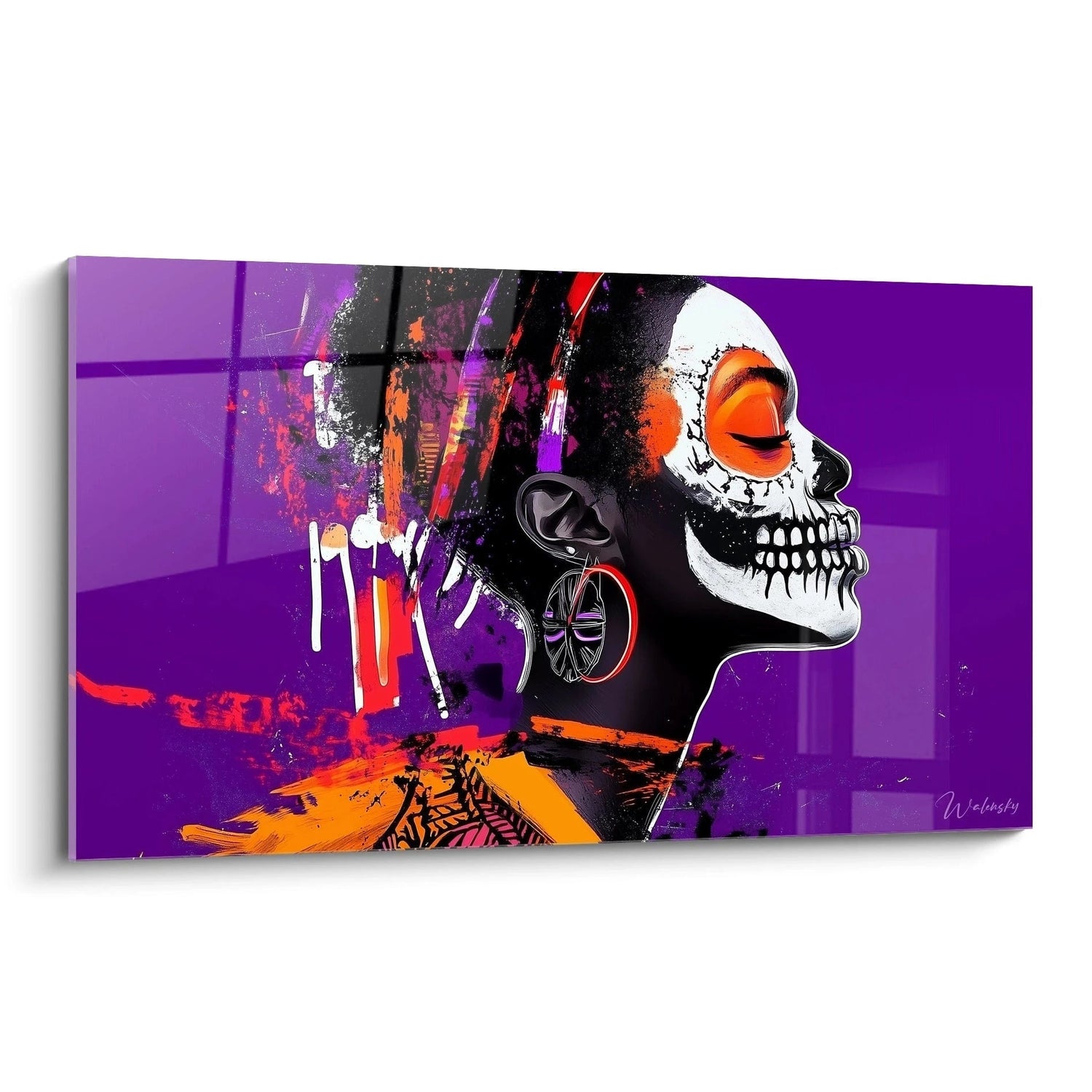 Cette décoration murale crâne coloré exploite parfaitement l'harmonie des couleurs complémentaires.