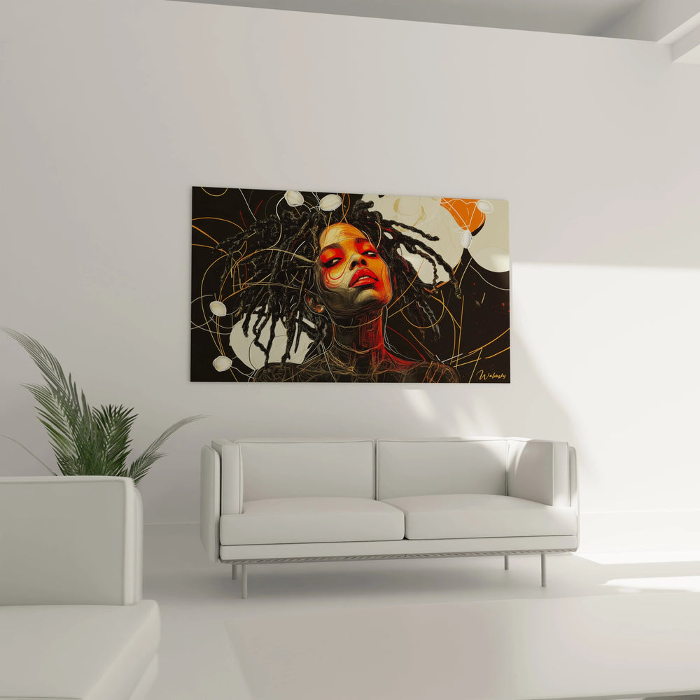 Ce tableau femme présente un portrait saisissant d'une femme aux dreadlocks dans un style artistique contemporain remarquable. L'œuvre se distingue par sa composition audacieuse mêlant réalisme et abstraction géométrique. Le visage de la femme, tourné vers le haut dans une expression contemplative, constitue le point focal central de cette décoration murale femme exceptionnelle. Les dreadlocks noires créent un contraste dramatique avec le fond aux tons chauds, tandis que des éléments circulaires dorés et oranges flottent autour du personnage principal. Cette œuvre femme moderne captive immédiatement le regard par son mélange harmonieux entre tradition et modernité artistique.
