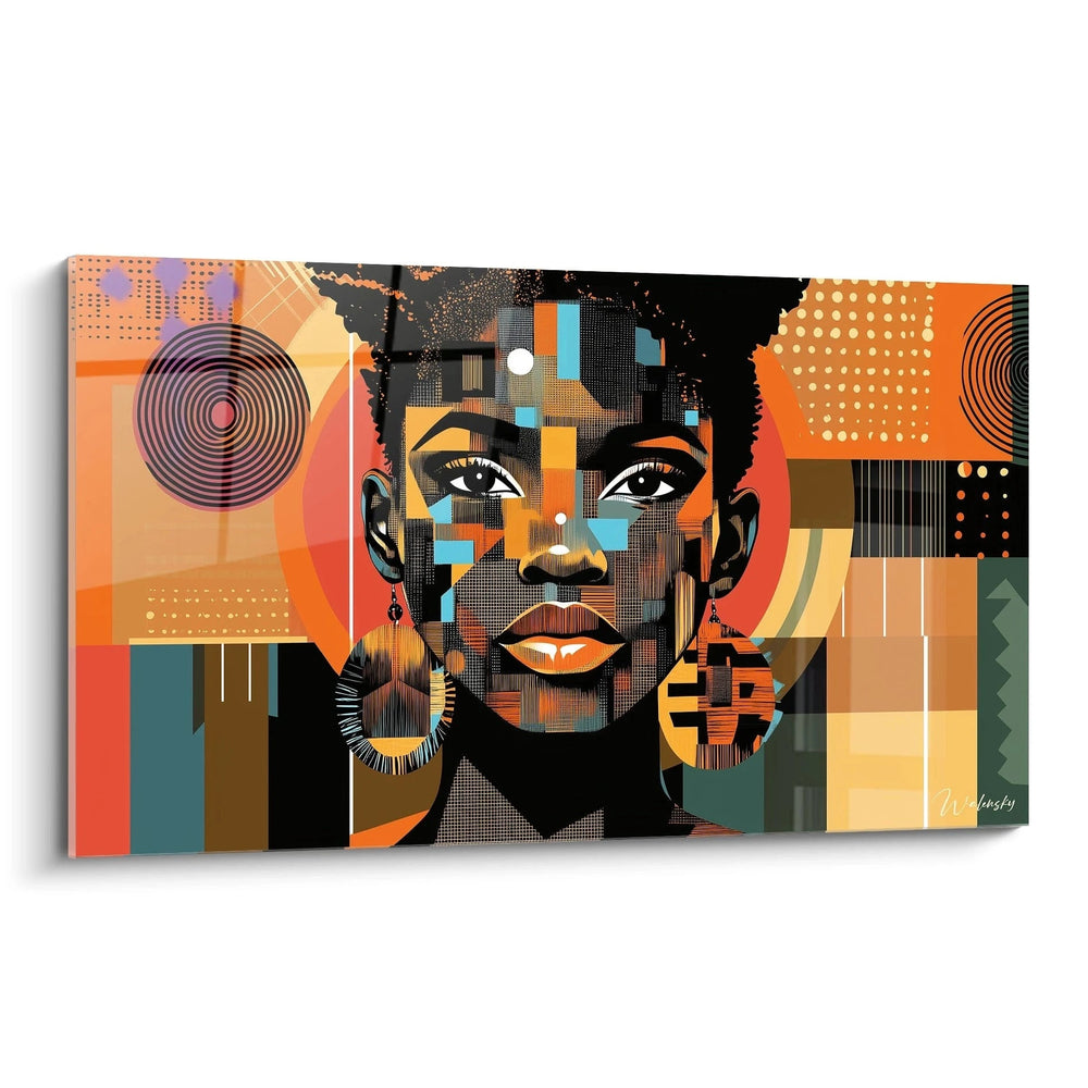 Cette œuvre se caractérise par une approche révolutionnaire du portrait féminin traditionnel. Le visage de la femme est décomposé en multiples facettes géométriques, chaque section révélant des couleurs et des motifs différents. Les yeux, particulièrement expressifs, restent le point focal central tandis que le reste du visage se transforme en un kaléidoscope de formes rectangulaires, circulaires et triangulaires. Cette tableau femme art contemporain utilise une technique de fragmentation qui rappelle le cubisme revisité à l'ère numérique, créant une tension visuelle fascinante entre réalisme et abstraction géométrique.