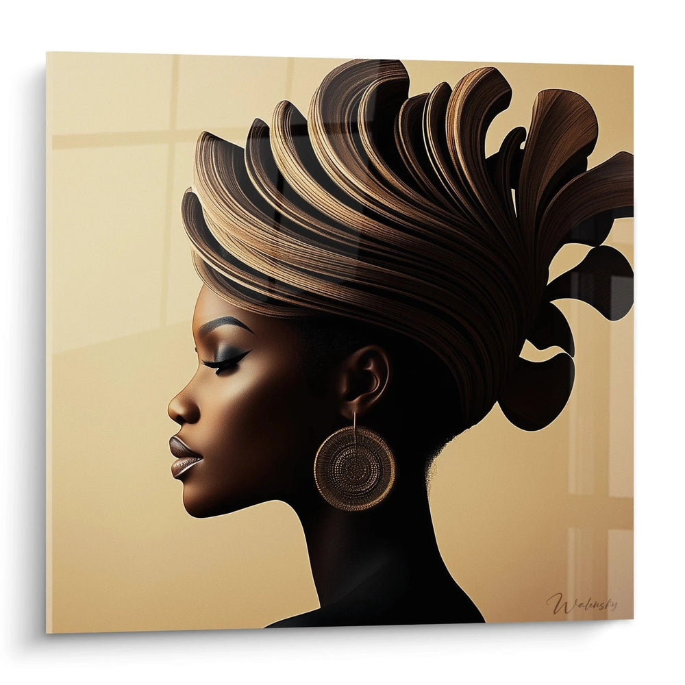 L'expérience visuelle de ce tableau femme style afrocentrique évolue selon la distance d'observation. À distance, l'œuvre impose sa présence par la majesté de sa composition et l'harmonie de ses couleurs chaudes. En s'approchant, les détails se révèlent progressivement : la finesse du modelé du visage, la complexité des volumes de la coiffure, les motifs géométriques des boucles d'oreilles. Cette art mural femme portrait révèle ainsi plusieurs niveaux de lecture, offrant une richesse d'observation qui se renouvelle à chaque contemplation. La profondeur de champ créée par les contrastes lumineux ajoute une dimension sculpturale saisissante.