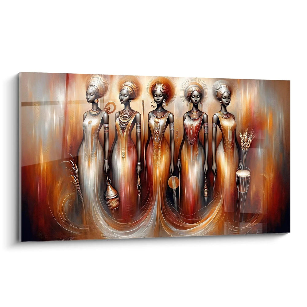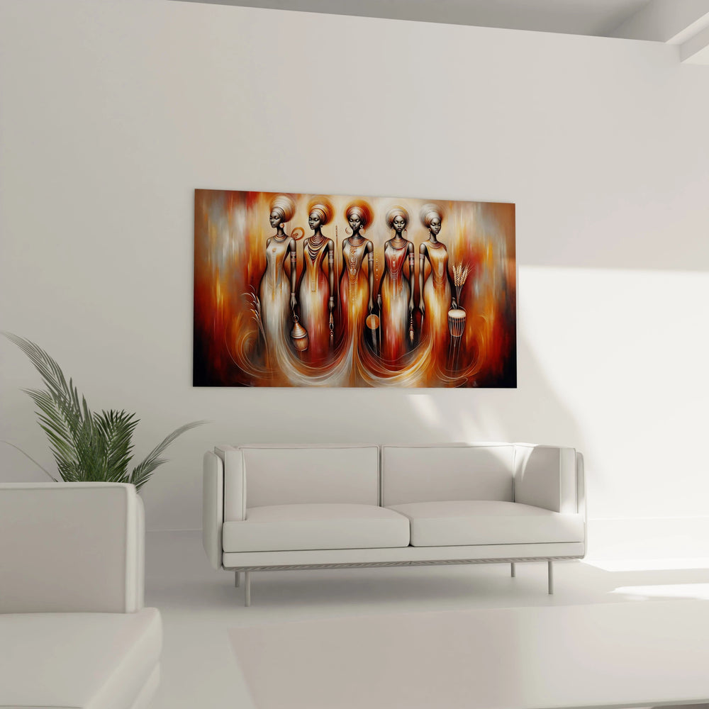 Ce tableau dépeint, avec des silhouettes élancées, la force et la beauté des femmes africaines plongées dans un rite ancestral. Chaque courbe, chaque ornement, parle d’histoires millénaires où la sagesse se transmet de mère en fille. L’or et le bronze, subtilement mêlés aux nuances chaleureuses de marron, diffusent une lumière douce qui enveloppe vos espaces d’une atmosphère chaleureuse et inspirante.