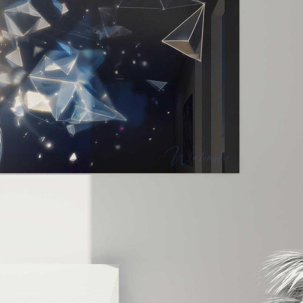 Ce tableau mural aigle présente une représentation saisissante d'un rapace dans un style art numérique contemporain. L'œuvre met en scène un aigle au plumage détaillé avec un rendu hyperréaliste, dont chaque plume est finement sculptée dans des tons argentés et gris métalliques. Le regard perçant de l'oiseau, tourné vers la droite, exprime une noblesse sauvage caractéristique des grands rapaces. L'arrière-plan se compose d'éléments géométriques cristallins flottants, créant un contraste fascinant entre la nature organique et l'esthétique futuriste. Ces formes polygonales lumineuses semblent se désintégrer ou se matérialiser autour du sujet principal, apportant une dimension science-fiction élégante à l'ensemble. La composition bénéficie d'un éclairage dramatique qui accentue les reliefs du plumage et fait ressortir l'intensité du regard de l'aigle. Ce tableau décoratif moderne s'inscrit parfaitement dans les tendances actuelles de l'art mural contemporain, offrant une pièce conversation captivante pour tout intérieur sophistiqué.