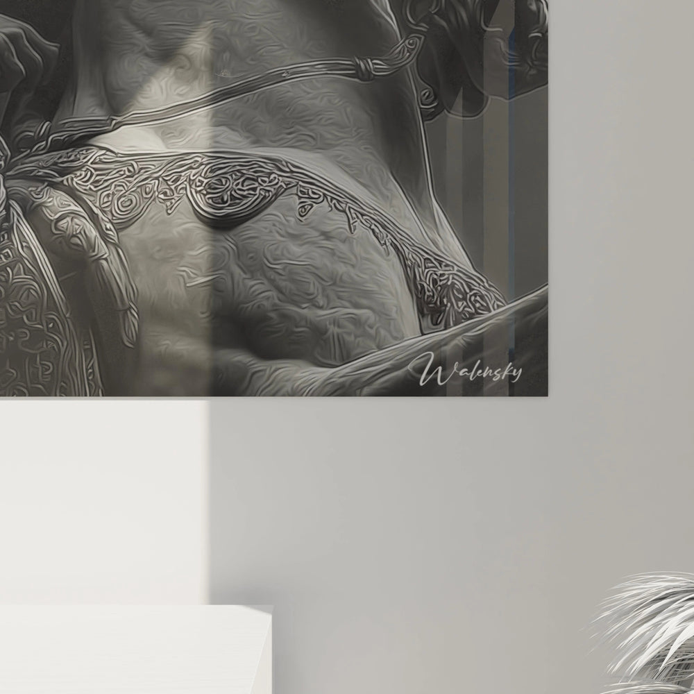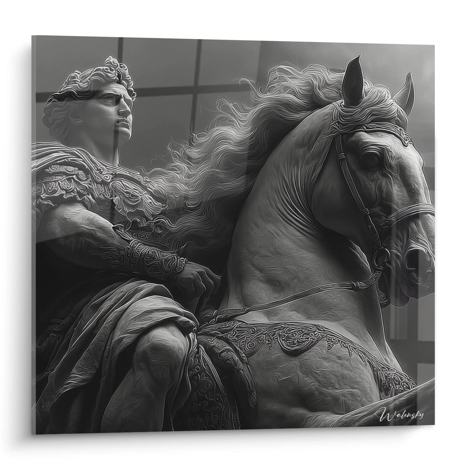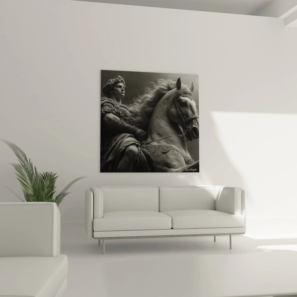Cette œuvre magistrale présente tableau Alexandre le Grand dans une composition dramatique en noir et blanc qui capture l'essence même du conquérant macédonien. L'image révèle immédiatement la puissance de ce tableau Alexandre le Grand conquérant à travers les détails saisissants du héros antique monté sur son destrier. Les nuances de gris créent une atmosphère épique qui transforme cette décoration murale Alexandre le Grand en véritable fenêtre sur l'histoire. La technique utilisée confère à cette œuvre une intensité remarquable, faisant de ce tableau Alexandre le Grand héroïque une pièce d'exception pour tout amateur d'art historique. Les premiers éléments qui frappent l'observateur sont la noblesse du personnage et la dynamique de la composition.