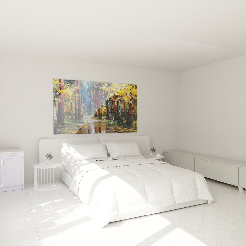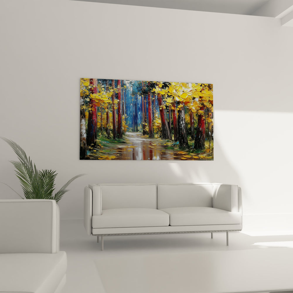 Ce tableau mural forêt présente une saisissante allée forestière baignée dans la lumière dorée de l'automne. L'artiste a magistralement capturé l'essence d'un chemin forestier bordé d'arbres majestueux dont les feuillages se parent de teintes chatoyantes allant du jaune éclatant à l'ocre profond. La technique de peinture à l'huile, appliquée au couteau, confère à cette œuvre d'art murale une texture riche et expressive qui fait vibrer chaque coup de pinceau. Le sentier automnal serpente gracieusement vers l'horizon, invitant le regard à se perdre dans cette forêt enchantée. Les reflets chatoyants sur le sol humide créent un jeu de miroirs naturel qui amplifie la beauté de cette scène forestière. Ce tableau décoratif forêt transforme instantanément l'atmosphère d'une pièce, apportant la sérénité et la magie des paysages forestiers dans votre intérieur. L'artiste a su saisir ce moment fugace où la nature révèle toute sa splendeur automnale, créant une décoration murale nature d'une rare intensité émotionnelle.