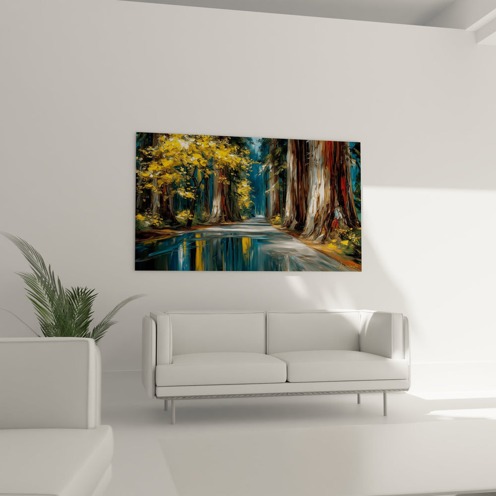 Ce tableau mural forêt capture avec une intensité saisissante une majestueuse allée forestière bordée de séquoias géants se reflétant dans un cours d'eau cristallin. L'artiste a magistralement représenté cette scène nature automnale où les troncs imposants des arbres centenaires s'élèvent vers un ciel bleu azur, créant une perspective naturelle d'une beauté époustouflante. Les reflets dorés dans l'eau apportent une dimension supplémentaire à cette composition, où chaque coup de pinceau révèle la texture rugueuse des écorces et la délicatesse du feuillage automnal. Cette peinture forêt impressionniste transforme instantanément votre espace en sanctuaire de tranquillité. Le jeu de lumières filtrant à travers la canopée crée des contrastes saisissants, tandis que le chemin qui serpente entre les géants végétaux invite à la contemplation et à l'évasion. Ce tableau décoratif nature s'impose comme une véritable fenêtre ouverte sur la splendeur de nos forêts ancestrales, offrant à votre intérieur une décoration murale paysage d'exception qui ne laisse personne indifférent.