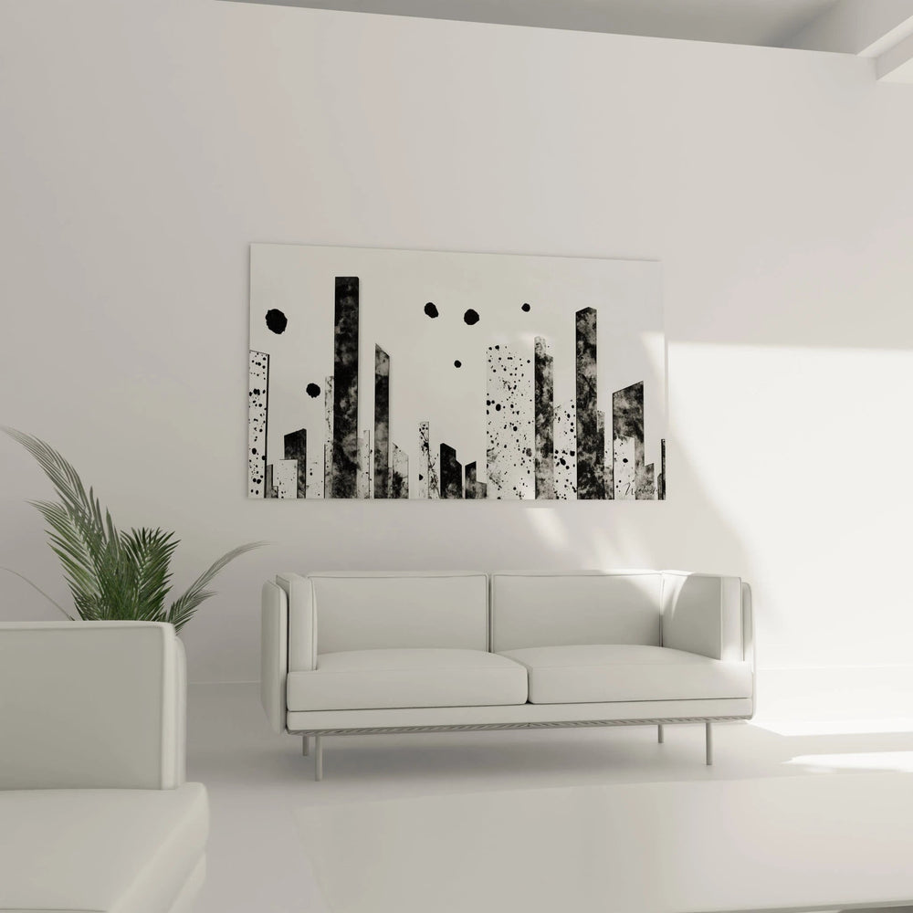 Ce tableau skyline tacheté noir et blanc révèle immédiatement sa nature urbaine contemporaine à travers une composition saisissante où se mélangent géométrie architecturale et spontanéité gestuelle. L'œuvre présente une silhouette de gratte-ciels stylisés qui s'élèvent verticalement sur la toile, créant un horizon urbain reconnaissable et évocateur. Les projections d'encre noire parsèment l'ensemble, générant un effet de tableau skyline expressionniste qui transcende la simple représentation architecturale. Cette première impression visuelle frappe par son contraste saisissant entre la rigueur des formes bâties et la liberté des éclaboussures organiques qui semblent défier la gravité urbaine.