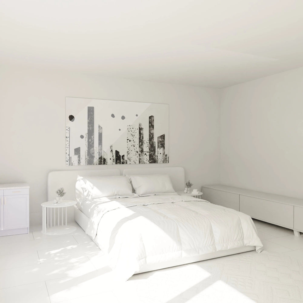 Cette œuvre s'épanouit particulièrement dans les environnements contemporains où son caractère urbain peut résonner avec l'architecture moderne. Un éclairage LED blanc neutre met en valeur les contrastes sans dénaturer la pureté monochrome de l'ensemble. Les murs blancs ou gris clair constituent l'écrin idéal pour cette décoration murale skyline, permettant à l'œuvre de respirer et d'exprimer toute sa force visuelle. L'association avec des matériaux comme le métal brossé, le béton ciré ou le bois brut crée des harmonies chromatiques qui prolongent l'esthétique urbaine de l'œuvre tout en respectant son essence minimaliste.