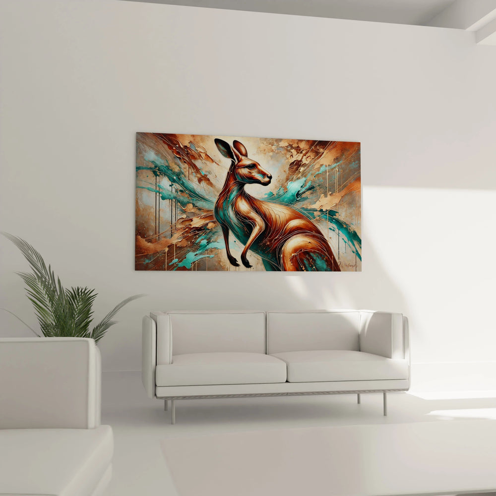Ce tableau est bien plus qu'une simple décoration : c’est un hommage vibrant à la faune emblématique de l’Outback. L’animal, figé en pleine course, incarne la résilience, la liberté et l’instinct sauvage. De ses teintes turquoise et bronze jaillit un équilibre parfait entre la force métallique et la douceur naturelle des paysages australiens. Chaque détail évoque la lumière d’un ciel infini et l’immensité des territoires sauvages, créant une ambiance à la fois énergique et apaisante.