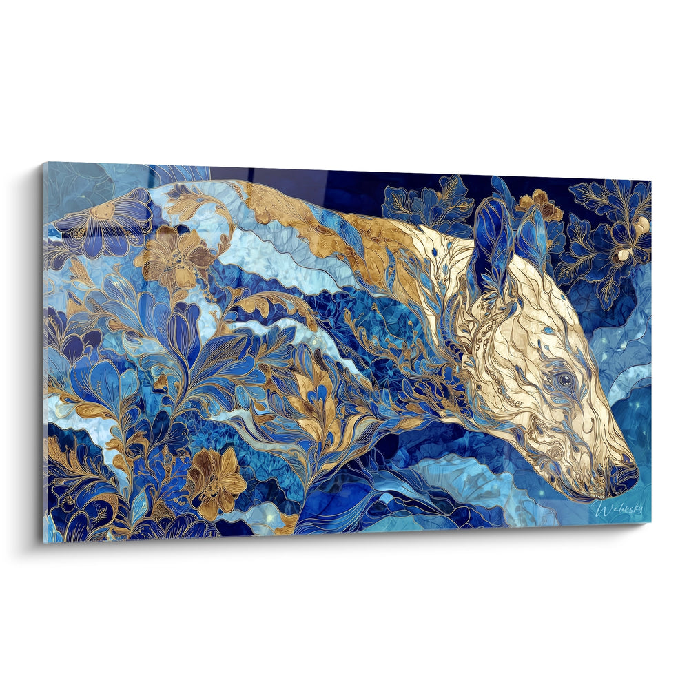 La palette chromatique de ce tableau Andrewsarchus décorative oscille entre les bleus profonds de l'océan et les dorures précieuses qui parent l'animal. Ces teintes évoquent la richesse des fonds marins. La symbolique de cette art mural cétacé orné renvoie à la sagesse ancestrale et à la beauté naturelle sublimée par l'art décoratif.
