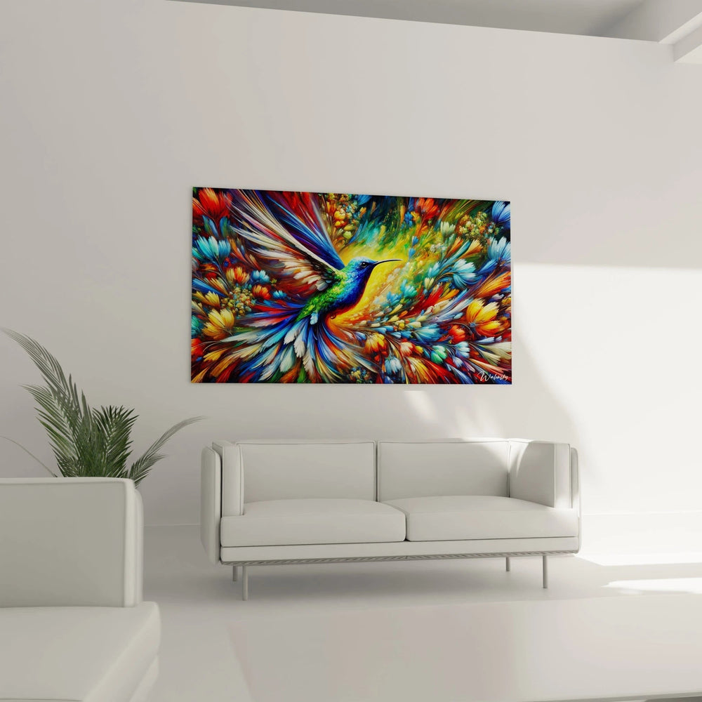 Imaginez un colibri capturé dans le calme éblouissant de son vol rapide, ses ailes battant avec une délicatesse infinie, porté par un tourbillon de couleurs éclatantes. Ce tableau inonde votre pièce d’une énergie lumineuse et d’une sophistication naturelle. La finesse du détail associe la précision du réalisme à l’audace d’abstractions colorées, créant une scène où la nature semble s’animer à chaque regard.