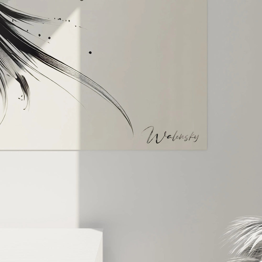 Chaque trait fin en noir et blanc évoque un équilibre parfait entre délicatesse et puissance. La composition minimaliste met en lumière la beauté intrinsèque de la nature, sans distraction ni surcharge. Vous vous laisserez hypnotiser par l’élégance presque palpable de cet oiseau, figé dans un battement d’ailes comme le ferait une poésie visuelle.