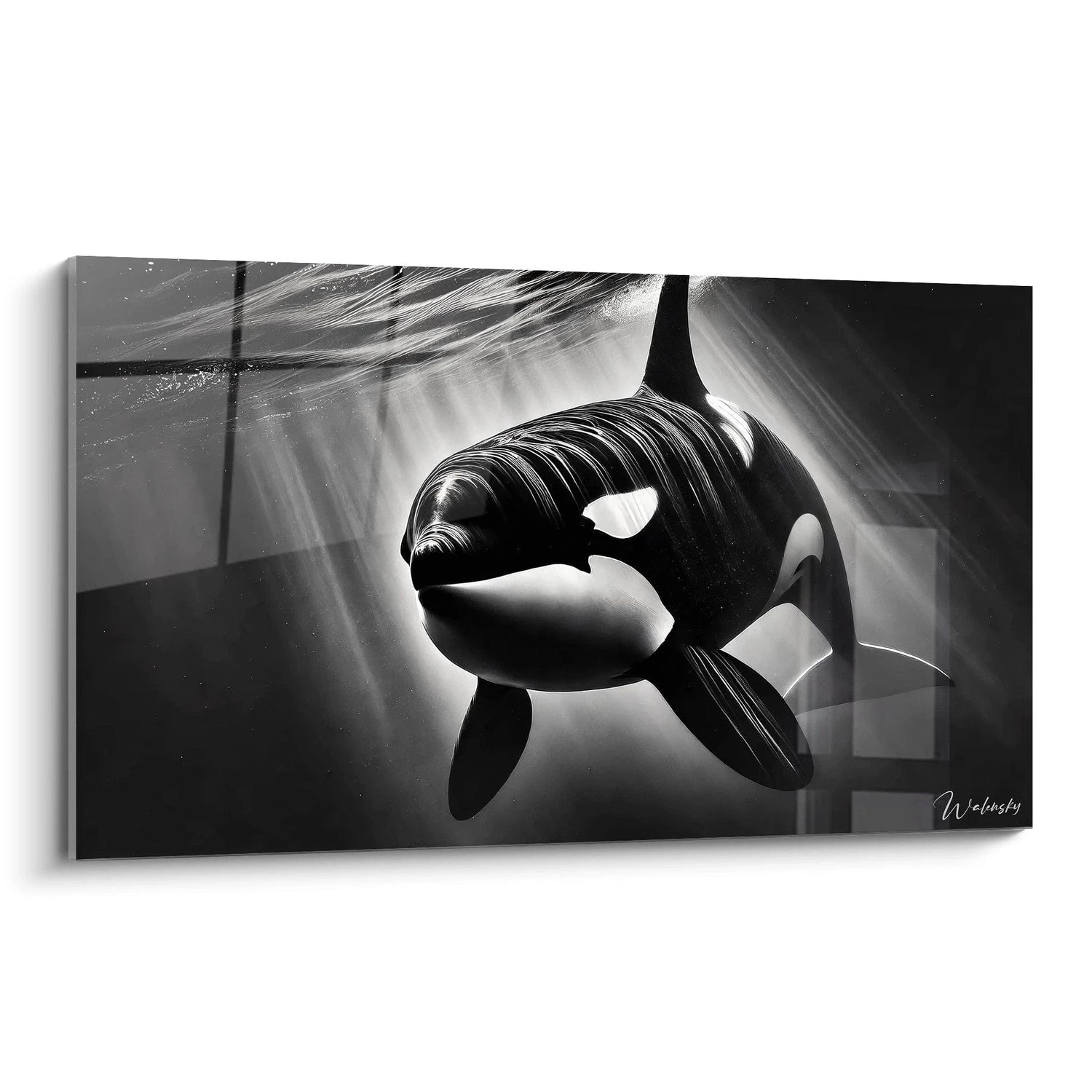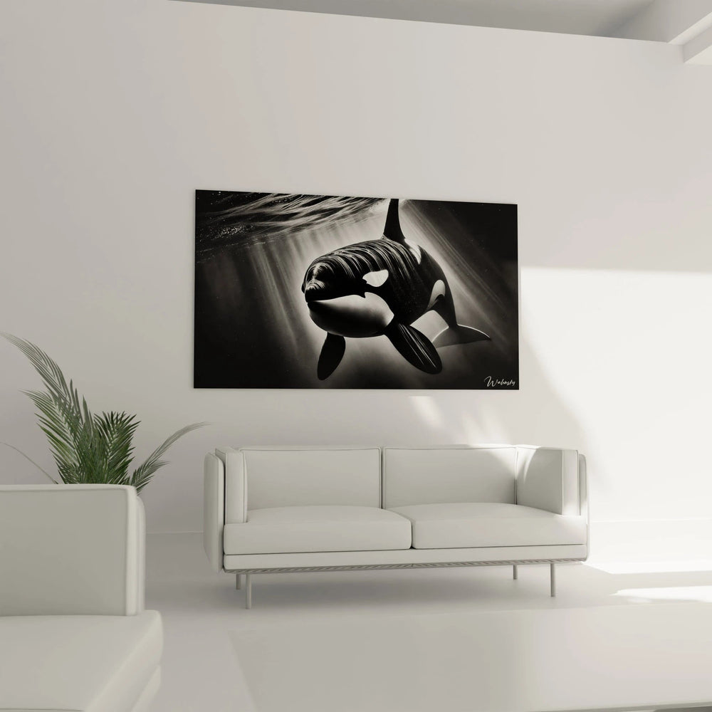 Plongez dans un univers d’élégance et de mystère avec le Tableau L'Orque des Abysses - Édition Animaux, une création qui sublime la force tranquille et la beauté profonde de cet être extraordinaire des océans. Imaginez-vous face à cette scène monochrome où les nuances de noir, blanc et gris dansent en un équilibre parfait, capturant la lumière subtile qui perce les profondeurs marines.
