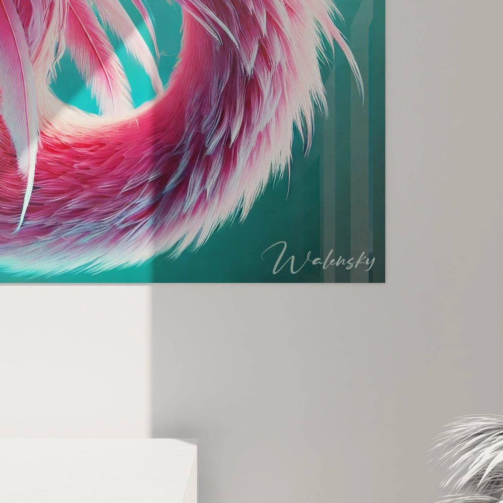 Chaque détail de ce tableau vous invite à contempler la splendeur d’un instant suspendu, où la lumière joue avec les nuances rosées et bleutées. Imaginez ces plumes délicates, presque palpables, qui semblent danser sous un souffle léger, tandis que le fond abstrait diffuse une aura lumineuse et apaisante. Cet équilibre parfait entre réalisme et touche surréaliste crée une ambiance où la sérénité cohabite avec une créativité éclatante.