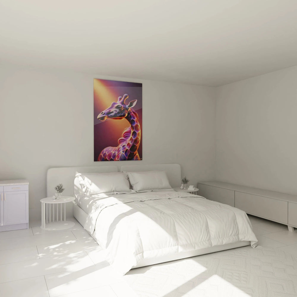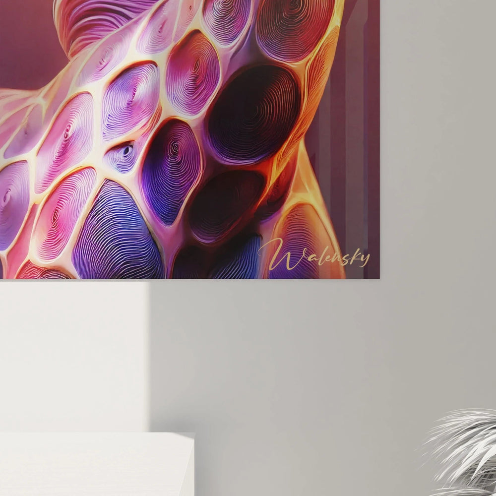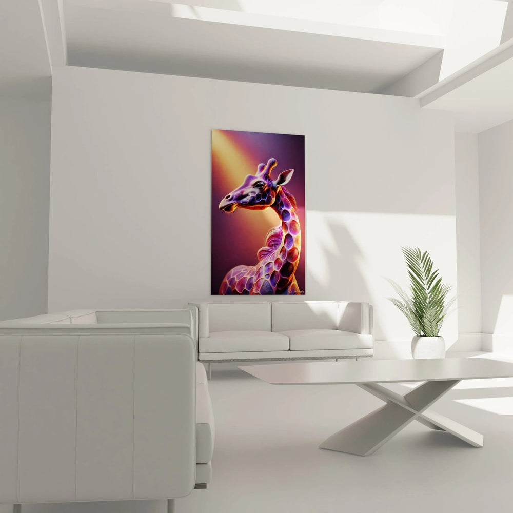 Imaginez ce tableau comme une fenêtre ouverte sur un univers où la grâce d’une girafe majestueuse se mêle à des jeux subtils de lumière et de textures. Les reflets pourpres veloutés, enrichis de touches d’or rose et de beige doux, créent une profondeur visuelle remarquable qui attire et captive le regard. Ce mariage de teintes rares évoque une atmosphère chaleureuse et précieuse, baignée d’une lumière douce qui magnifie chaque détail.